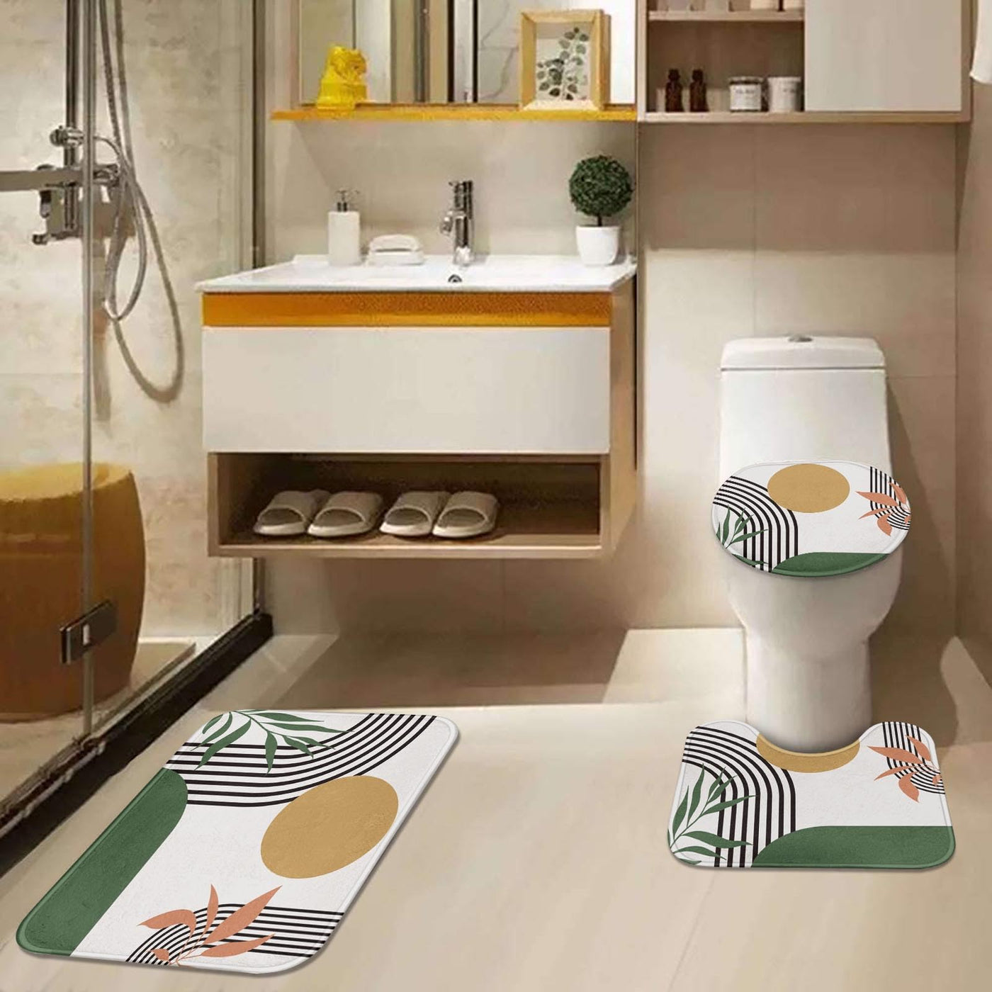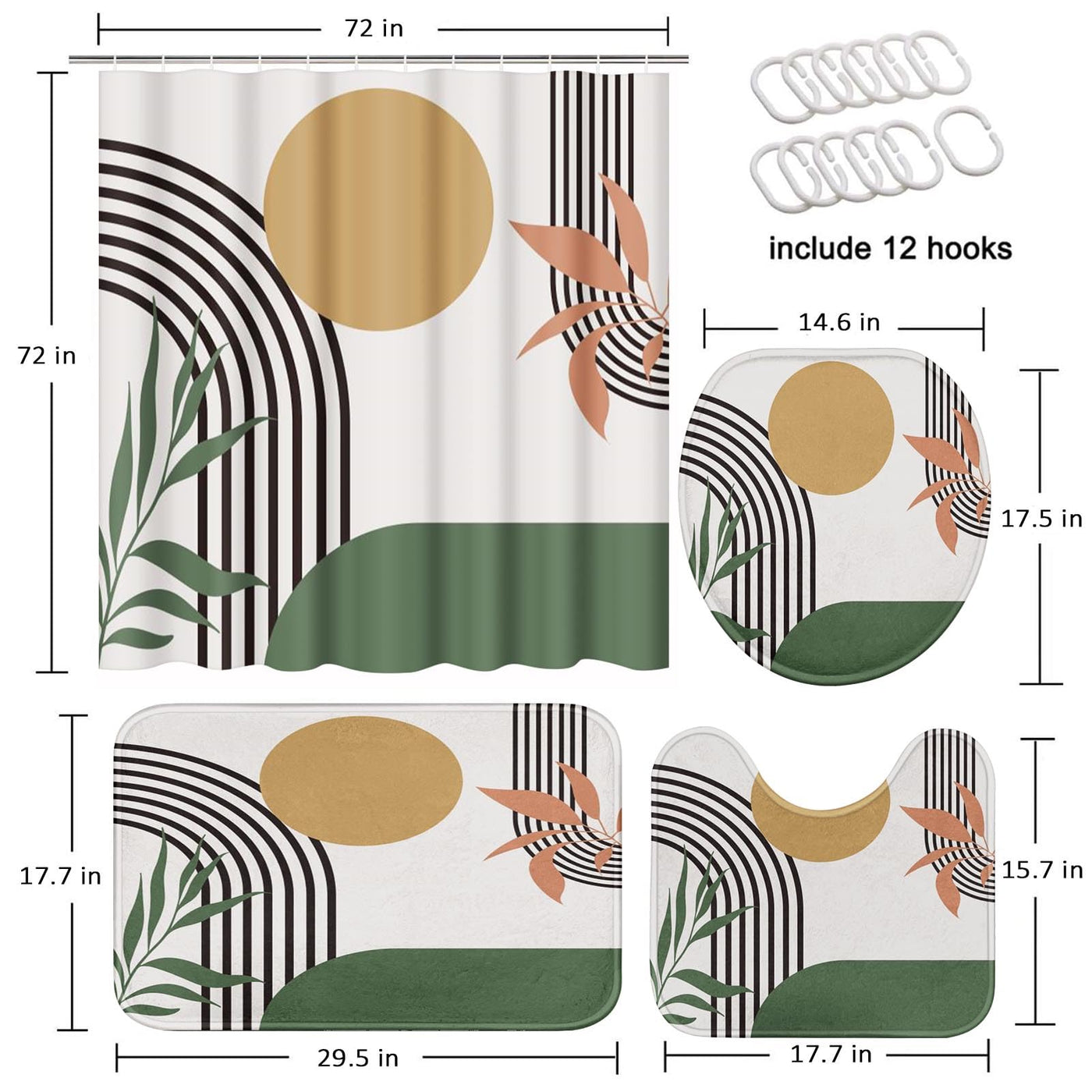 Tayney Boho Mid Century Shower Curtain Set With Toilet Lid Cover And Non-Slip Rugs, Abstract Green 4 Pcs Modern Minimalist Showe