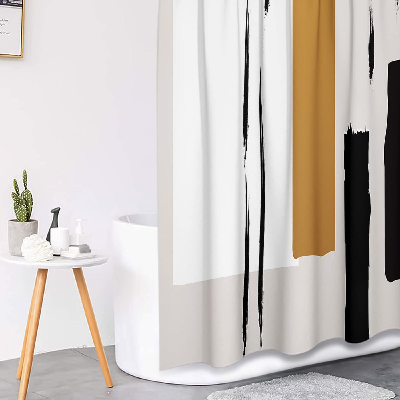 Q: How does the design of this shower curtain set enhance my bathroom decor?A: The Tayney Boho Mid Century Shower Curtain Set features an abstract line art design that adds a modern minimalist touch to your bathroom, creating a warm and stylish atmosphere.