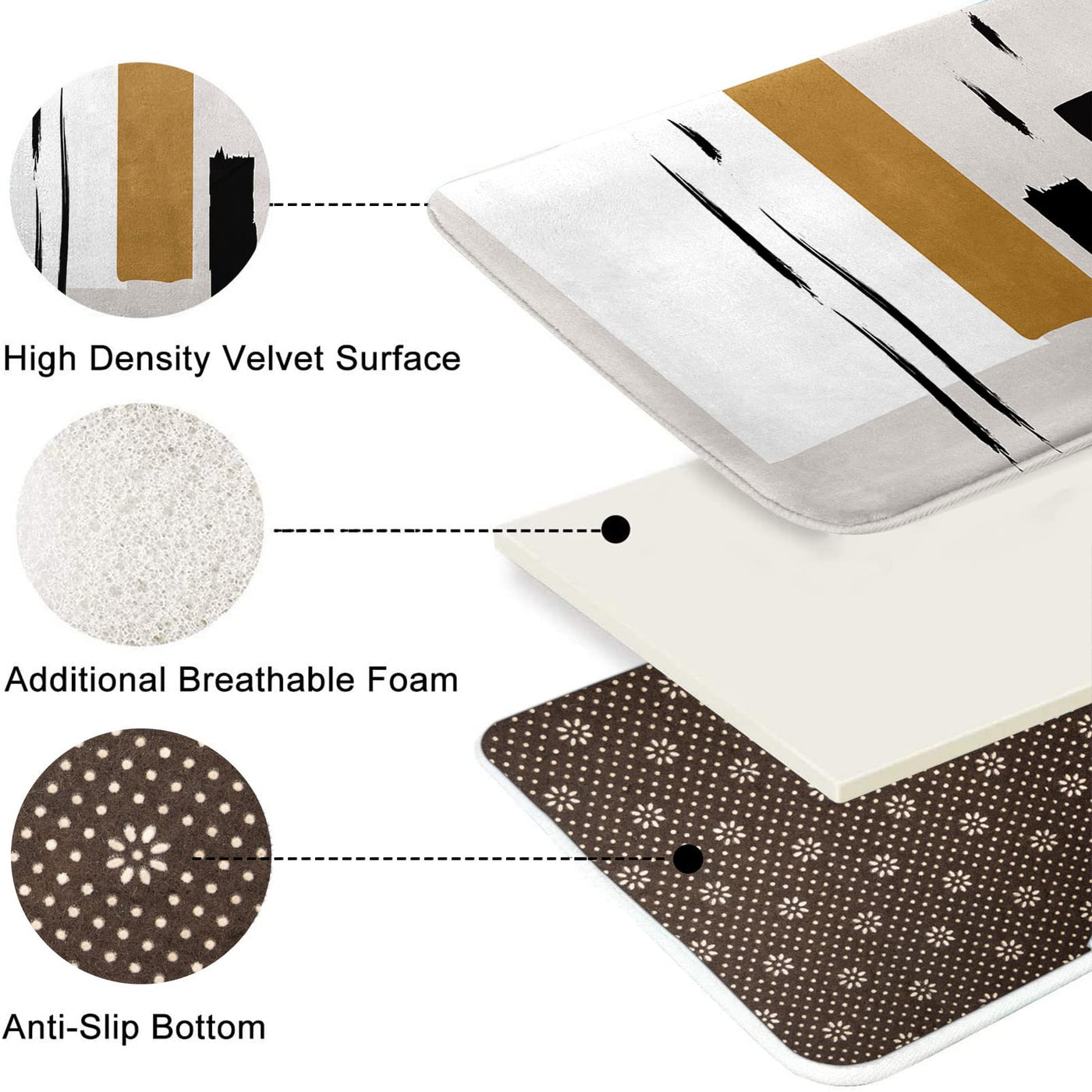 Q: What are the dimensions of the Tayney Boho Mid Century Shower Curtain Set?A: The Tayney Boho Mid Century Shower Curtain Set includes a shower curtain measuring 72"L x 72"W, a thickened bathroom mat measuring 29.5"L x 17.7"W, a toilet lid cover measuring 17.5"L x 14.6"W, and a U-shaped rug measuring 17.7"L x 15.7"W.