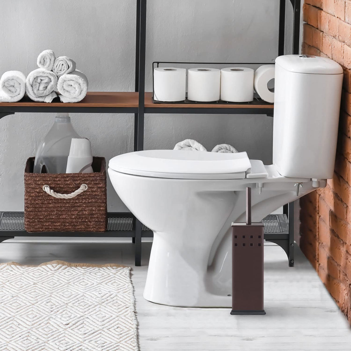 Q: Does the design of the holder allow for discreet storage of the brush?A: Yes, the modern square design of the toilet brush holder hides the brush from view while allowing it to dry, maintaining a tidy appearance in your bathroom.