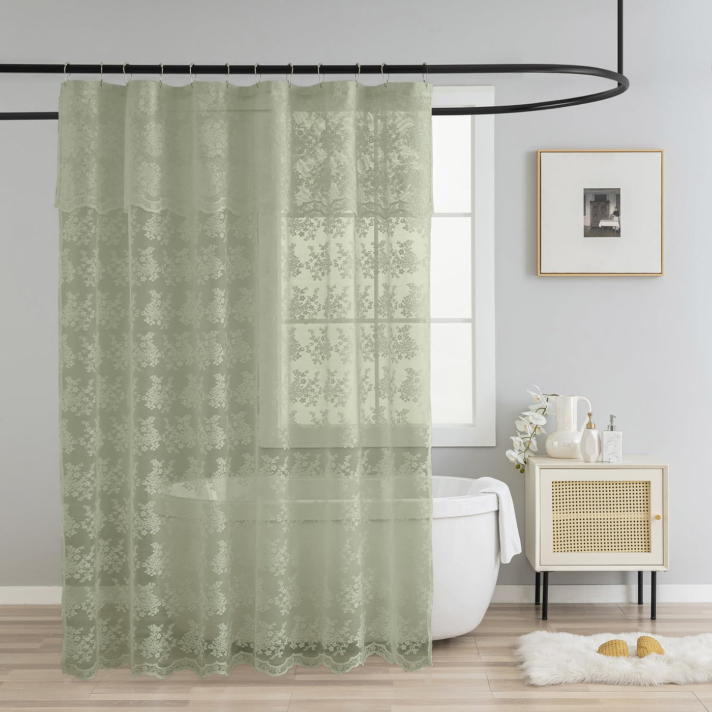 Tudeco Vintage Sage Green Lace Shower Curtain With Attach Valance Classic Floret Sheer Shower Curtain 72 X 72 Inch ,1 Panel Package Includes:1 Panel Lace Sheer Shower Curtain&Nbsp; Material :100% Polyester Lace Fabric Pattren:Floral Color: Sage Green Size: 72 X 72 Inch Hanging Style : Reinforced Holes Top Care Instruction:Machine Washable In Cold Water; Gentle Cycle; Tumble Dry Low; Do Not Bleach.