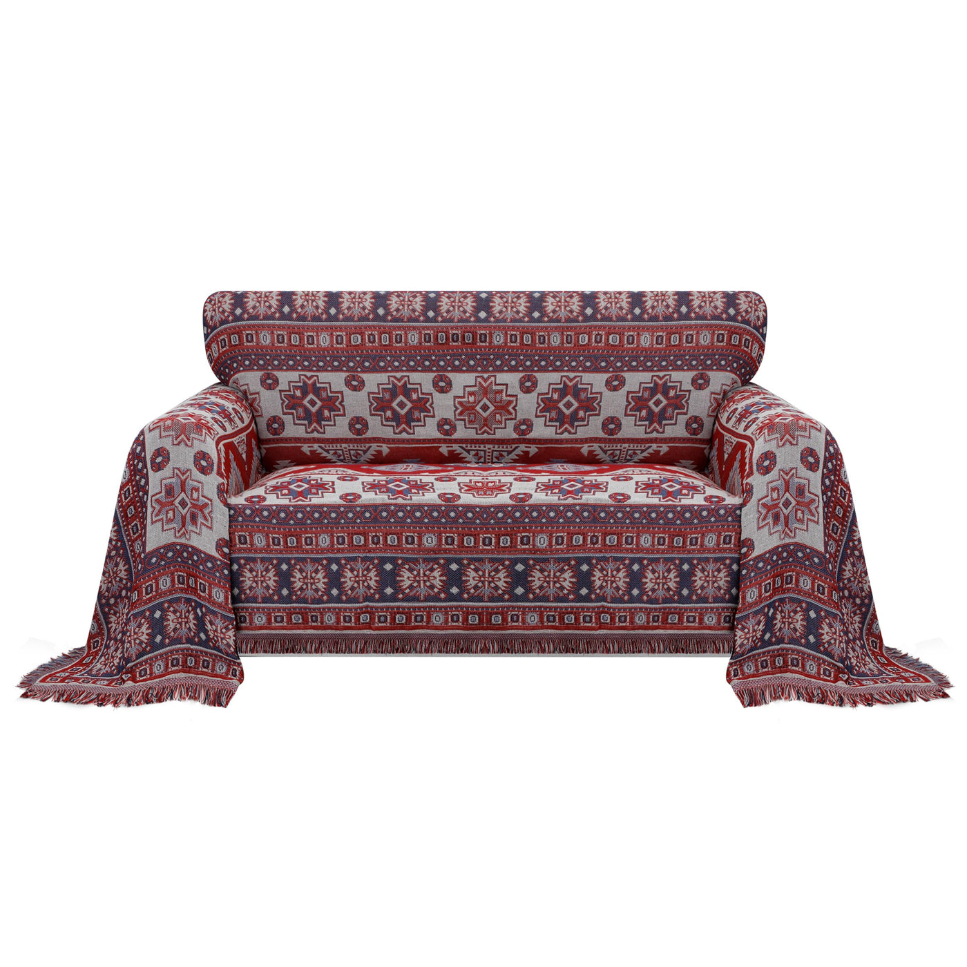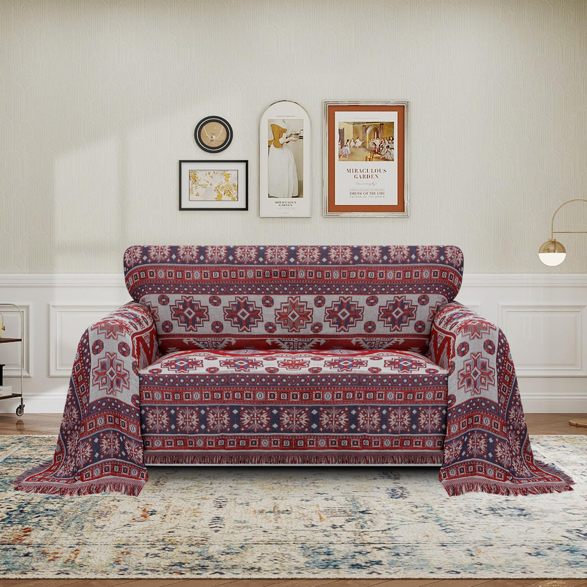Purefit Geometric Jacquard Throw Sofa Cover - Textured Soft Washable Decorative Couch Covers For 3 Cushion Couch, Throw Cover With Tassels Furniture Protector For Pets, Kids (Medium, Bohemia Red)