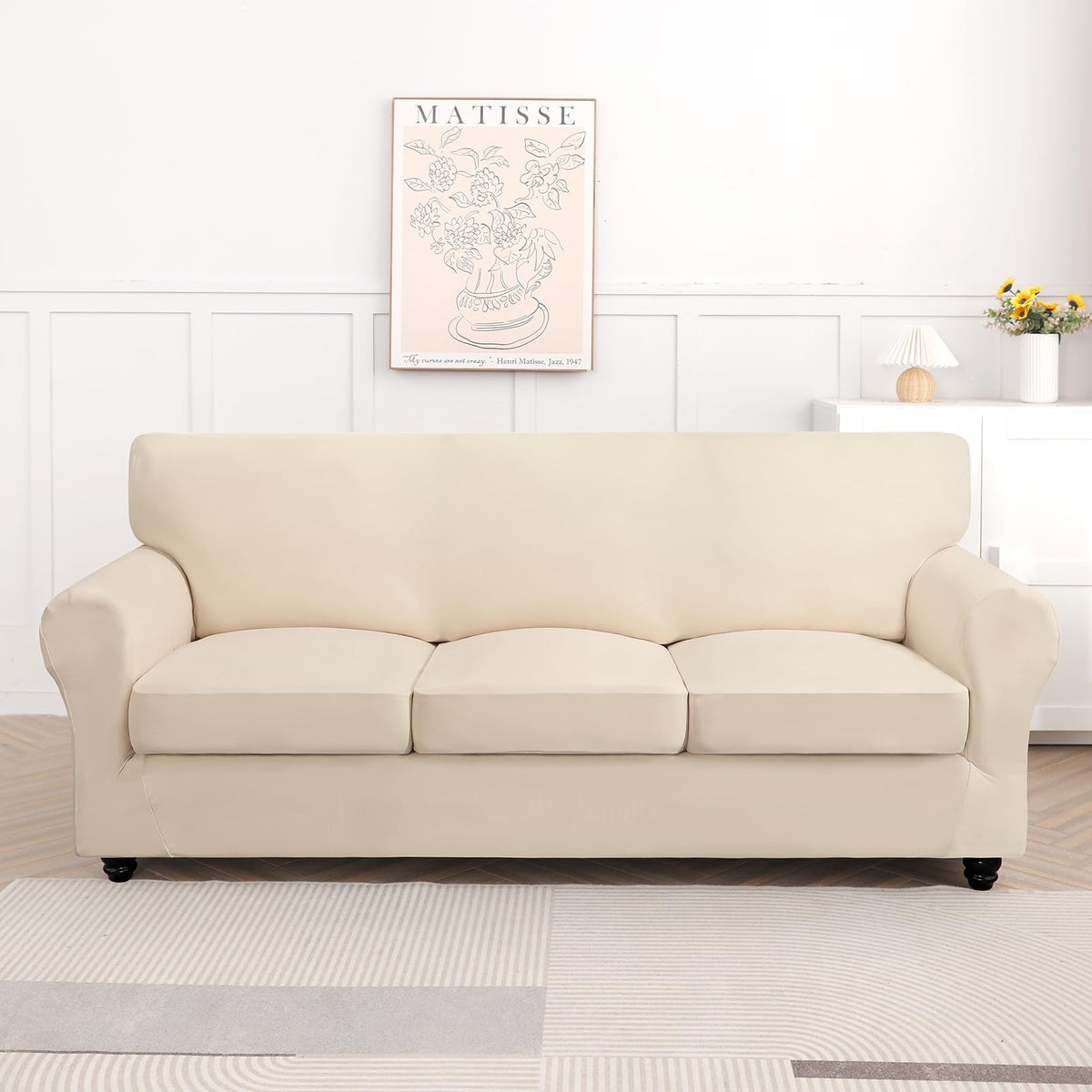 SearchI Stretch Sofa Cover Couch Cover, 4 Pieces Sofa Slipcover with 3 Separate Cushion Cover, Washable Furniture Protector for Living Room(Sofa, Beige)