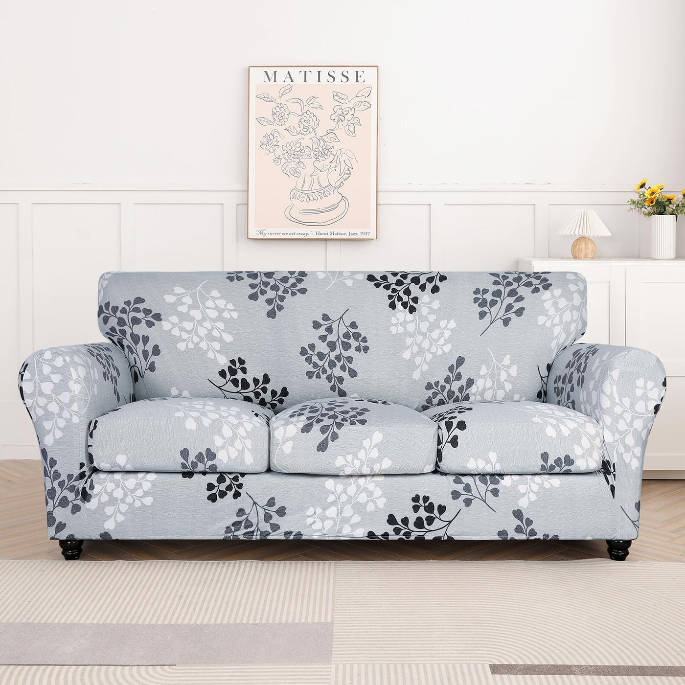 SearchI Stretch Sofa Cover Printed Couch Cover, Floral Pattern 4 Pieces Sofa Slipcover with 3 Separate Cushion Cover, Washable Furniture Protector for Living Room(Sofa, Leaf Pattern)