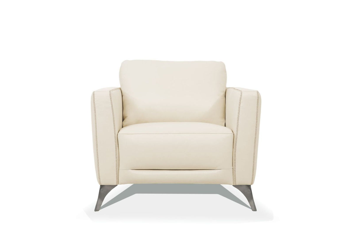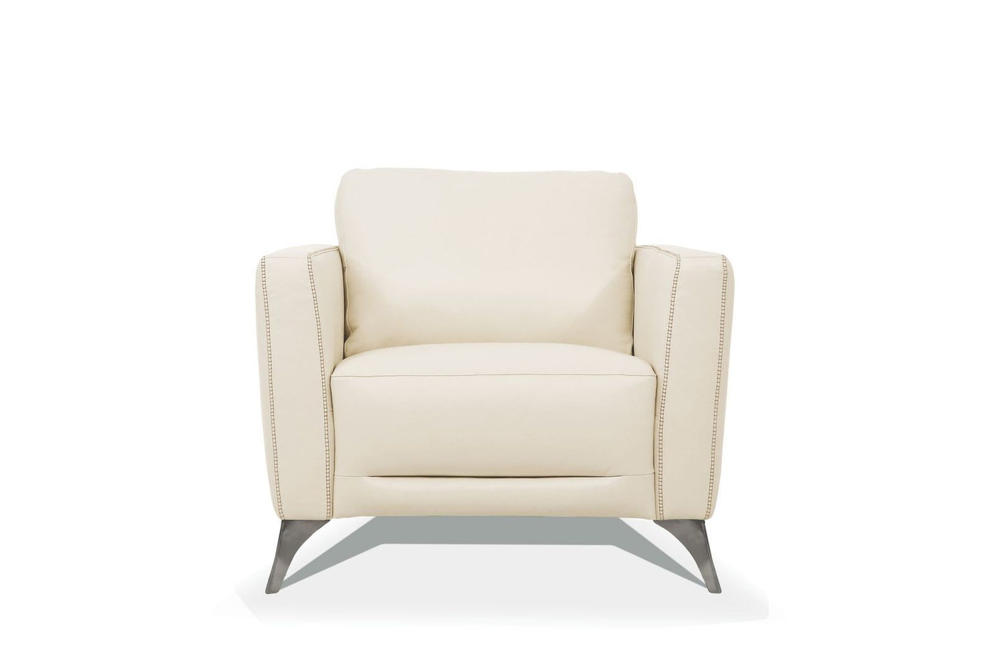 Make a chic addition to your living room, the chair is one you will want to spend lots of time in. This beautiful cream chair features contrast tone stitching and unique chrome legs. Its deep, comfy seat and track-style padded arms give it an incredible sink-right-in quality that s perfect for the whole family.