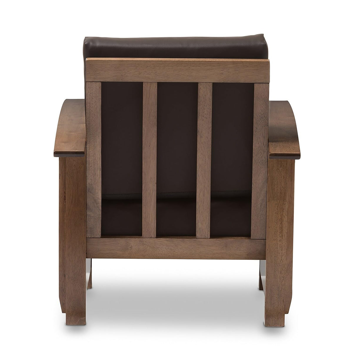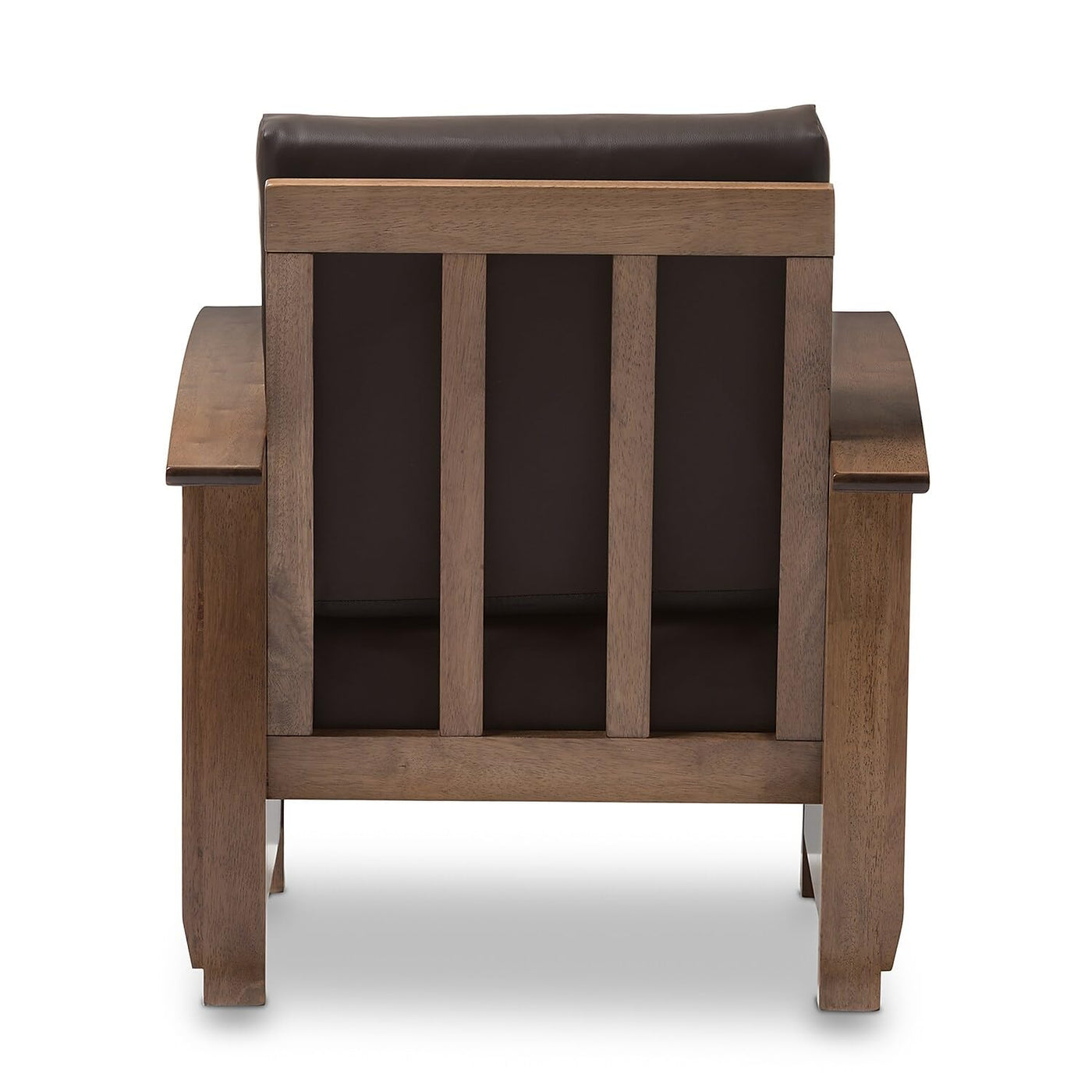 - Mission style living room lounge chair. - Dark brown faux leather upholstery. - Removable cushions. - Slatted backrest. - Self-assembly required. - Made in Malaysia. - Dimensions: 35.1" High x 28.04" Wide x 32.76" Deep; Seating Dimensions: 16.58" High (from Floor) x 20.87" Wide x 19.89" Deep; Arm Height: 7.41" High; Height (from Floor to Top of Arms): 23.21" High.