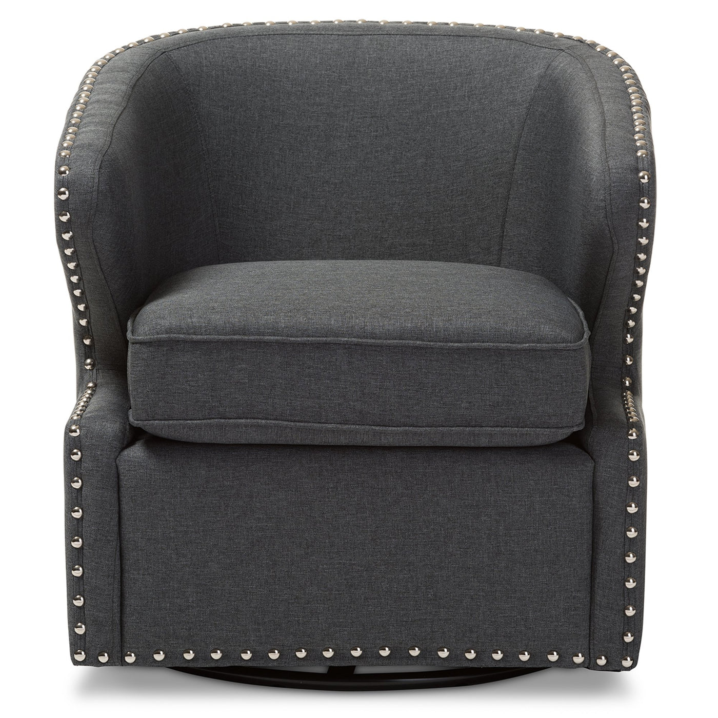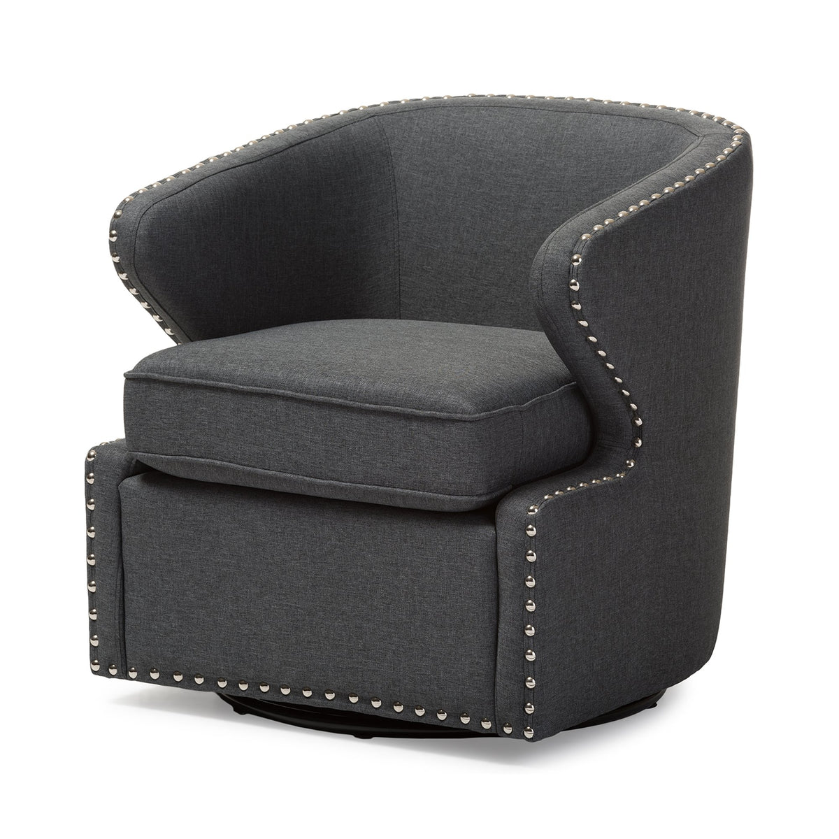 Crafted from the ground up, the Finley armchair was intentionally designed to be a piece that reflected classical shapes, offering a comforting feel of the familiar, while also challenging design concepts with it's angular armrests, edge piping and silver nail heads trim. Featuring swivel base, the Finley armchair is constructed of solid wood frame and is upholstered in grey polyester fabric. Imbuing a sense of mid-century retro modern design, the Finley armchair will work well with your modern home decor. Made in China, the swivel armchair requires minor assembly.