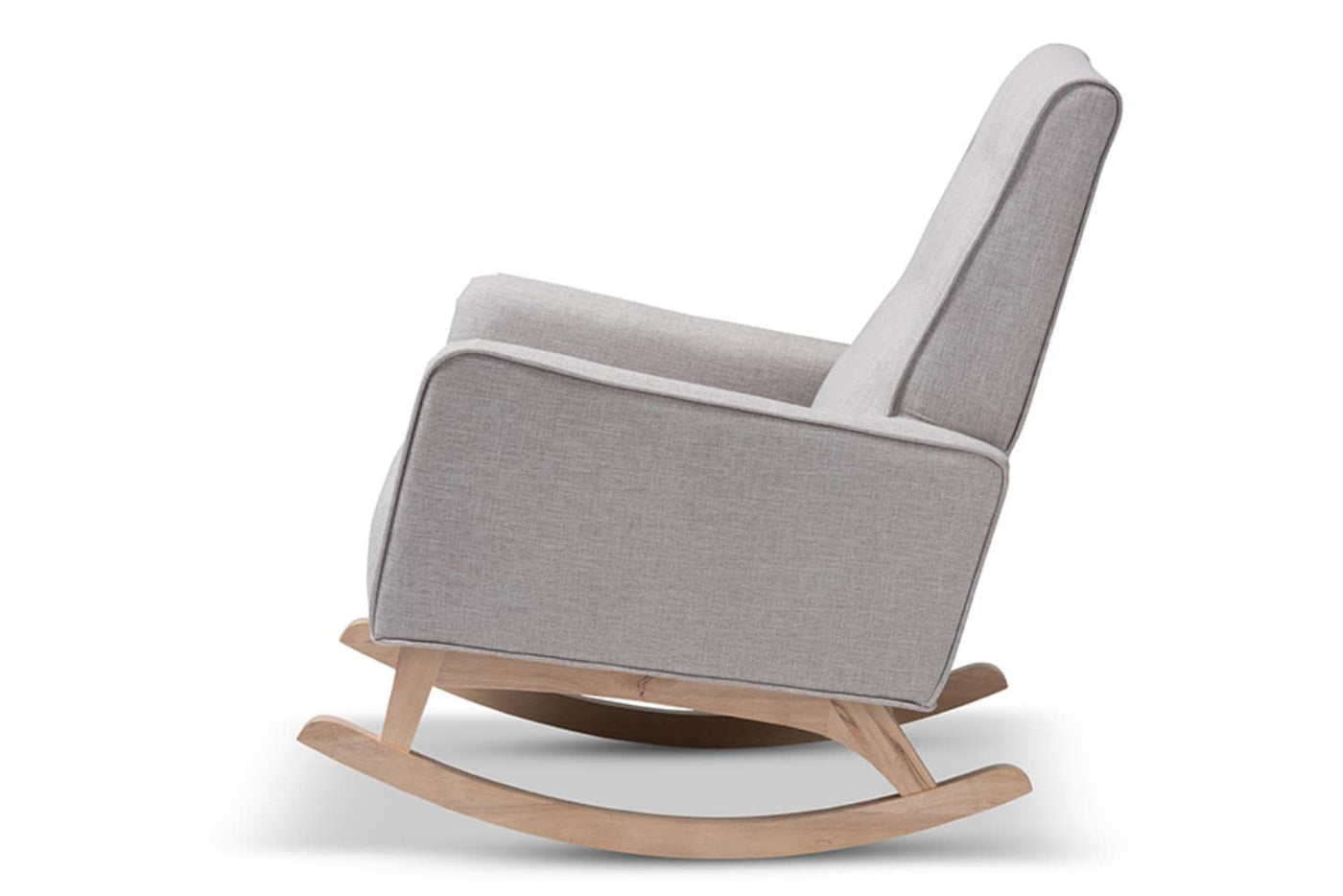 Sophisticated style and smooth, calming lines come together in the Marlena rocking chair. This mid-century modern-inspired rocking chair features greyish beige fabric upholstery with button-tufting details and a subtle piping design. The low-profile Marlena rests on solid, whitewashed rubberwood legs. This rocking chair is foam padded, with the arms at an ergonomically designed height to make it easy to get cozy and stay relaxed. The Marlena is a stylish and comfortable addition to your nursery, livingroom, or any shared space. Made in Malaysia, this rocking chair requires assembly.