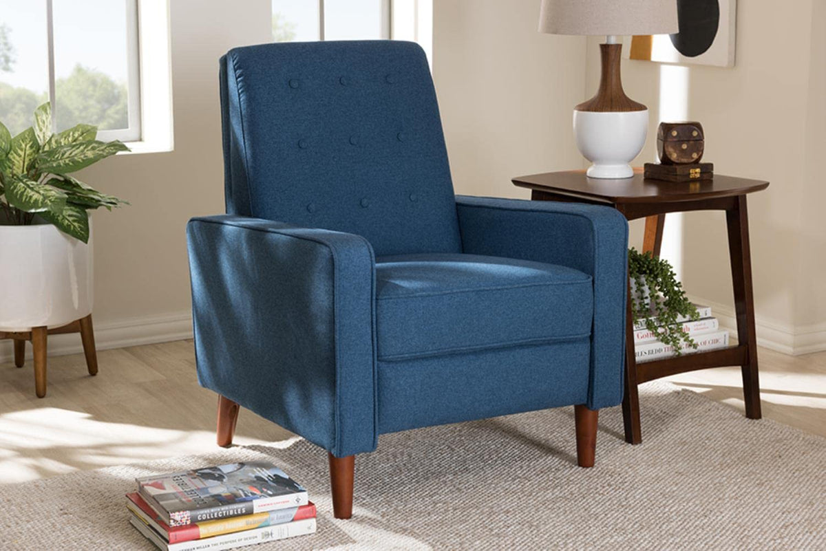Sit back and relax in style with the Mathias recliner. The Mathias recliner's modern and contemporary-inspired look exemplifies the minimalist chic of modern design. Constructed with sturdy hardwood and plywood, this chair is built to last. Enjoy comfort with the chair's reclining back, raiseable footrest, and hidden steel push-back mechanism. The Mathias features blue fabric, button-tufted upholstery over foam padding, making this a cozy addition to your living room, home office or entertainment room. Walnut-finished eucalyptus legs complete the sophisticated style of the Mathias. Made in China, this recliner requires assembly.