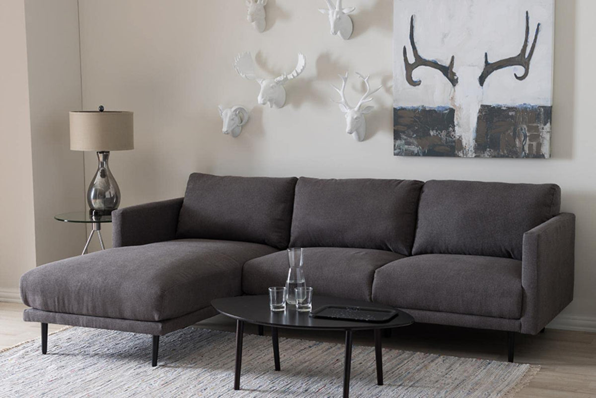 With a gentle gradient across the backrest, the Riley left facing chaise sectional sofa offers a comfortable seating position, striking the ideal balance between sink in comfort and ample support. Constructed of plywood frame, the Riley is upholstered with S-spring, fix cushion, foam and pocket spring for ultimate seating comfort. Metal legs support the sectional sturdily. Available in grey fabric, the Riley features neutral tone that will match with your home decor. The perfect blend of good looks and practical seating, the Riley 2-piece sectional sofa is built for comfort at home. Perfect for those who want to lean back, put up their feet and get comfortable. Made in China, the Riley requires assembly.Features Mid-century sectional sofaLeft facing chaise configurationFabric upholstered seatPlywood frameBlack metal legsAssembly requiredMade in ChinaSET INCLUDES: One (1) Sectional SofaSTYLE: Mid-CenturyCOMPOSITION: Fabric Woven "Polyester 100%"/Plywood/Metal/FoamCOLOR: GreyDimensions: 31.1" High x 94.49" Wide x 64.57" Deep; Sofa Part Seating Dimensions: 16.93" High (from Floor) x 59.45" Wide x 21.65" Deep; Chaise Part Seating Dimensions: 16.93" High (from Floor) x 33.07" Wide x 59.84" Deep; Height (From Floor to top of arms): 26.38" High; Arm Height: 9.45" High; Legs: 6.89" High