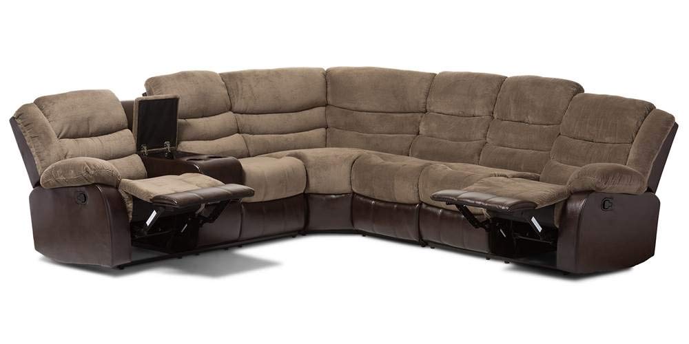 The impressive Robinson modern and contemporary taupe polyester fabric and brown faux leather two-tone 7-piece sectional has everything you need to create the perfect headquarters for the big game or movie night. Offering the best in casual contemporary comfort, the Robinson sectional is packed with features designed to help you fully relax. Upholstered in padded towel fabric and faux leather, this deluxe sectional looks as inviting as it feels. This cozy sectional features plush pillow top arms, a pub back cushion with lumbar support and two reclining padded chaise footrest that provides full leg support. A storage console featuring dual cup holders is the icing on the cake. This oversized sectional accommodates up to six adults. The Robinson has everything you need to create the perfect headquarters for the big game or movie night. Made in China, the sectional requires minor assembly.