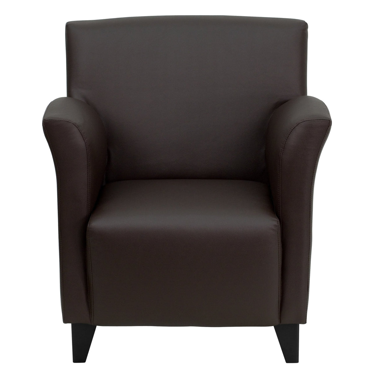 Flash Furniture Hercules Roman Reception Chair Featuring Flaired Arms Is Made Of Brown Colored Durable Leather And An Ideal Choice To Enhance Your Home Decor. Make The Lobby Or Waiting Space Comfortable And Elegant With The Flash Furniture Reception Chair. With A Foam Back And Fixed Arms, This Chair Provides You With Adequate Support And Comfort. Featuring Leathersoft Upholstery, This Brown Reception Chair Will Easily Blend In With Your Decor. Stable Legs And A Metal Frame Give This Chair Stability. Reception Chair To Enhance The Look Of Your Waiting Area. Attractive Brown Leathersoft Upholstery That Is Durable And Long Lasting. Overall Dimensions: 34"H X 30"W X 27"D. Seat Dimensions: 18"H X 19"W X 19"D; Back Dimensions: 18''H X 27''W. Metal Feet Ensure Stability. Fixed Arms Offer Adequate Forearm Support. 2-Year Warranty. Brown Leathersoft Upholstery. Flaired Arms. Arm Height From Floor: 27 1/2"H, Arm Height From Seat: 10 1/2"H.Made Of Eco-Friendly Materials. Taut Seat And Back. Leathersoft Is Leather And Polyurethane For Added Softness And Durability.