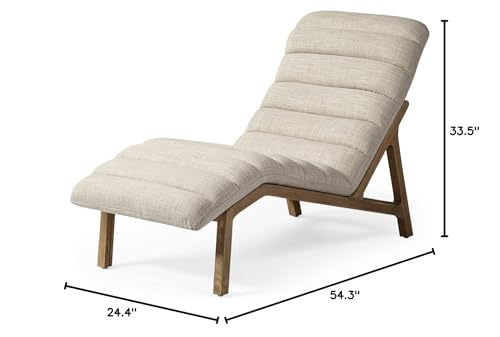 A spectacular chaise lounge chair with a cream fabric-wrapped seat, situated on a wooden base, this makes it an extremely comfortable and visually appealing addition to contemporary spaces.