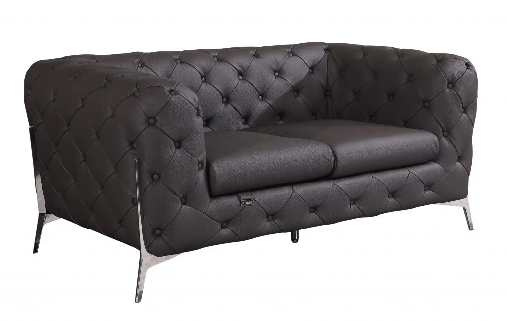 HomeRoots 69" Dark Brown Tufted Italian Leather and Chrome Love Seat