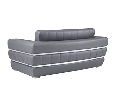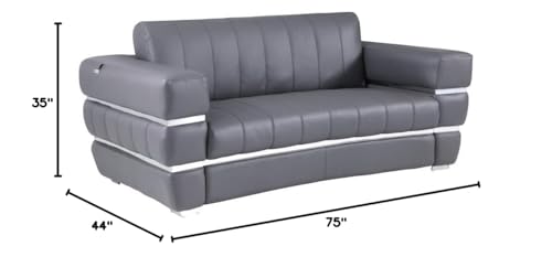 Fabulously soft, leather upper construction gives this 75-inch Dark Gray Italian Leather with Chrome Accents an edge over the competition. The leather used makes your lounging luxuriously comfortable and adds an elegant appeal to your space. The square arms offer a comfortable place to rest and give this piece some interest and shape. The metal legs effortlessly elevate the room and add a touch of contemporary design. A showpiece for your room, this two-seater sofa is a must-have. 35"H x 75"W x 44"D