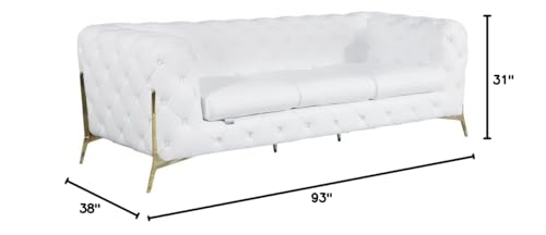Made from the highest quality supple leather, this 93-inch White and Gold Genuine Leather Standard Sofa will be the star of your space. The high quality premium leather used makes your lounging luxuriously comfortable and, along with button detailing, adds an elegant appeal to your space. The fabric suspension construction gives this piece strong support and makes it comfortable to sit on even for long periods of time. The round arm offers a comfortable place to rest and give this piece some interest and shape. The shiny gold legs effortlessly elevate the room and add a touch of contemporary glamorous design. A great showpiece for your room, this sofa is a must-have. 31"H x 93"W x 38"D