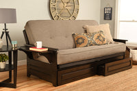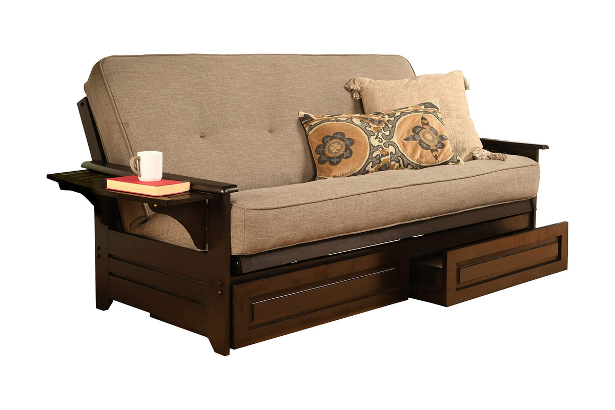 The Futon Is A Classic Hardwood Frame With Tray Style Arms. This Unique And Versatile Full Size Futon Sofa Easily Converts To A Bed. This Multifunctional Piece Of Furniture Can Find A Home In Just About Any Type Of Room. Mattress Dimensions: 75L X 54W X 8H; Frame Dimensions: 82L X 37D X 33H.