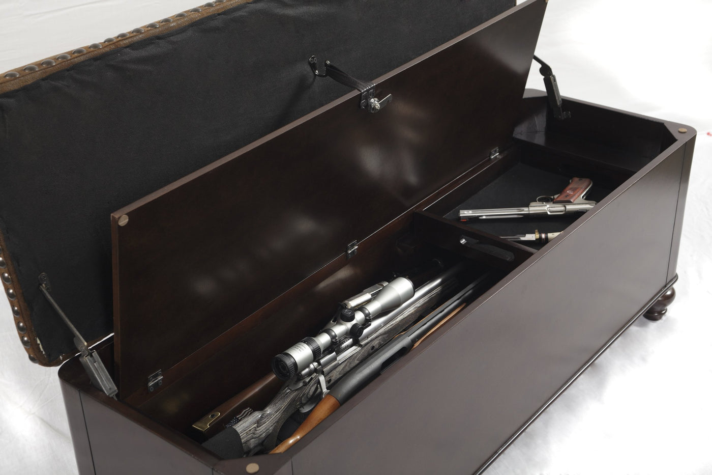 This handsome, ready-to-assemble gun concealment bench is constructed of wood and wood veneers. The tufted, durable micro fiber seat will provide years of long wear. Inside is a hidden locking compartment that holds 6 long guns as well as a removable tray.