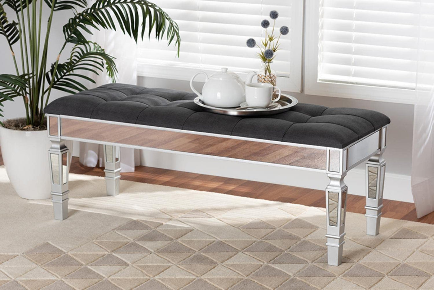 Exhibit an air of grandeur in your space with the refined elegance of the Hedia accent bench. Made in China, this stunning piece is comprised of a solid wood frame fitted with mirrored glass panels for an extraordinary display. Its seat features a plush, foam-padded cushion upholstered in fabric showcasing a classic button-tufted design for a beautiful blend of form and function. The Hedia requires assembly and utilizes tapered legs for excellent stability and support while forming a sleek silhouette. Introducing modern grace to any room layout, the Hedia accent bench enhances the feel of any space.