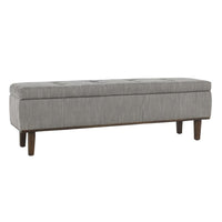Elegantly appointed with tufted upholstery and a contrasting wood frame, this bench makes a chic addition to any space. Interior storage makes this piece a versatile yet stylish solution for a bedroom, entryway, or office.Features:Materials: Rubber wood , polyesterFinish: Gray, neutralSeats up to 2Tight seatVersatile storage solutionTufted seatCleaning instructions, care instructions: Spot clean only. Use water-based upholstery cleaning products. Protect your furniture from sun and direct light, as fabric can naturally fade if exposed to the sun.Specifications:Product Dimensions: 17"H x 54"W x 15"DProduct Weight: 41.1 lbsSeat Dimensions: (Overall) 17"H x 54"W x 15"DLeg Dimensions: 6"H x 1.7"W x 1.7"DWeight Capacity: 500 lbs