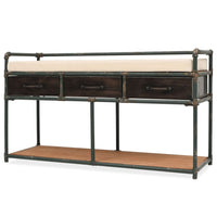 This storage bench will make a striking accessory for your bedroom or living room.This sturdy and durable bench is made of steel and solid wood. It may have some imperfections, which are not intentionally made but nonetheless add to the bench's antique look and industrial charm. The 3 drawers and the bottom shelf provide ample storage space for keeping a wide variety of items. The cushion adds to the bench's seating comfort.Assembly is easy.Material: Steel + solid fir wood + MDFCushion material: FabricDimensions: 42.3" x 13.6" x 23.2" (L x W x H)With 3 drawers and 1 bottom shelfEasy assemblyFabric: Cotton: 15%, Polyester: 85%