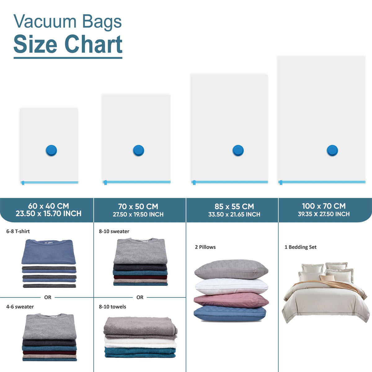 Q: What items can I store in these vacuum bags?A: These vacuum storage bags are versatile and can be used for a variety of items including clothing, comforters, pillows, towels, and blankets. They're ideal for maximizing storage space in closets, suitcases, or lofts.