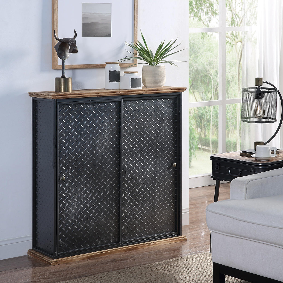 Add valuable hidden storage anywhere in your home with the Barton Storage Cabinet. The 2 Door Diamond plated metal style doors slide open to 4 fixed metal shelves. The industrial styled Metal cabinet style brings a bit of nostalgia to your kitchen, entryway, hall, laundry room, mudroom, or any room of the house! Use in the mudroom or entryway to be sure you always have those last-minute items ready to go when you walk out the door. The metal can easily be cleaned with a dry non abrasive cloth so you can store anything from cleaning supplies to pantry items or extra throws and board games. The four concealed shelves provide plenty of space for storage no matter where you need it. The decorative solid rustic pine top and base give this item the added touch. Assembly required.