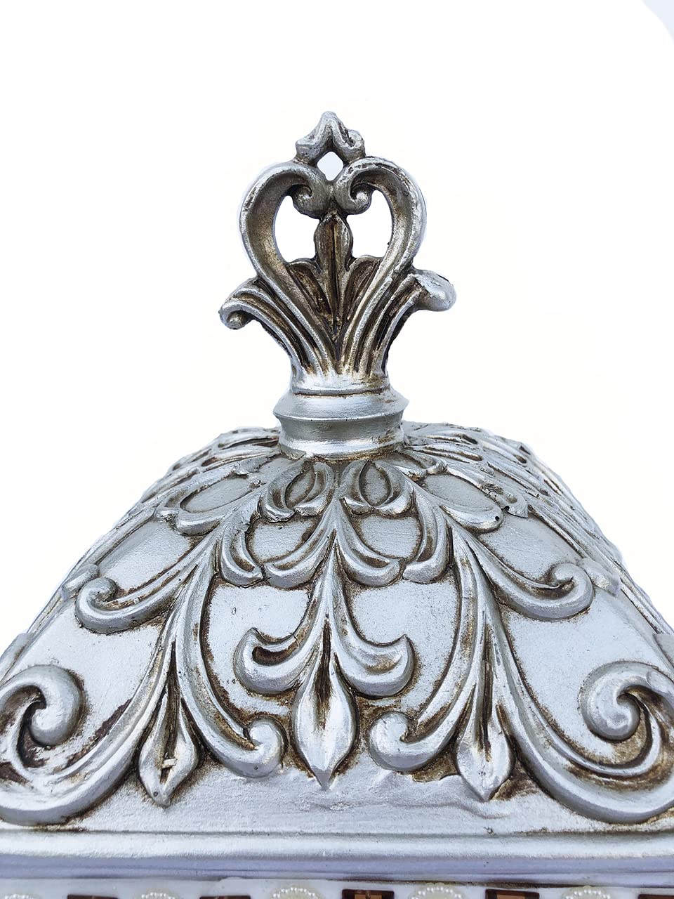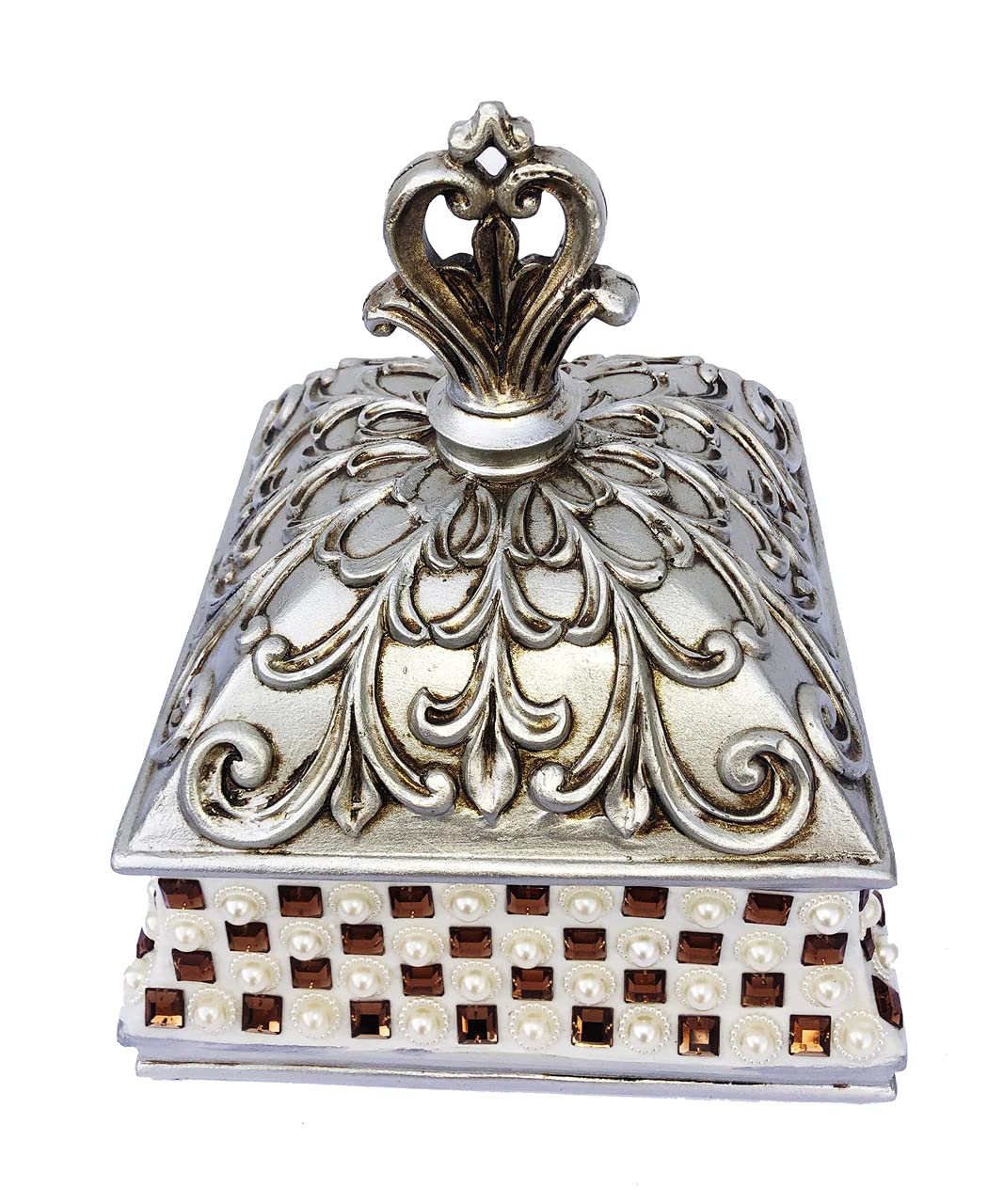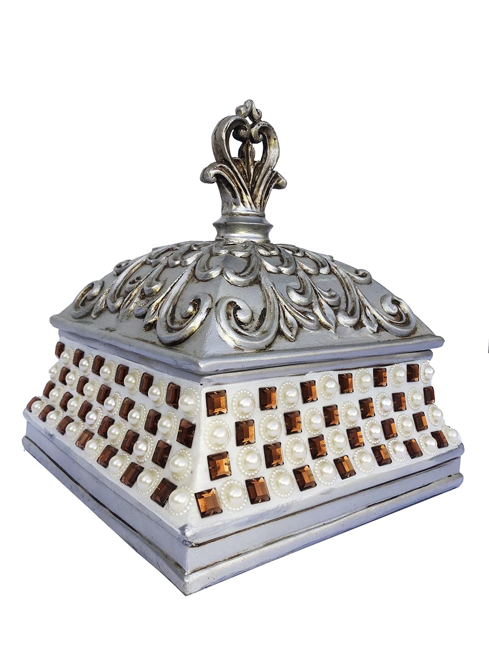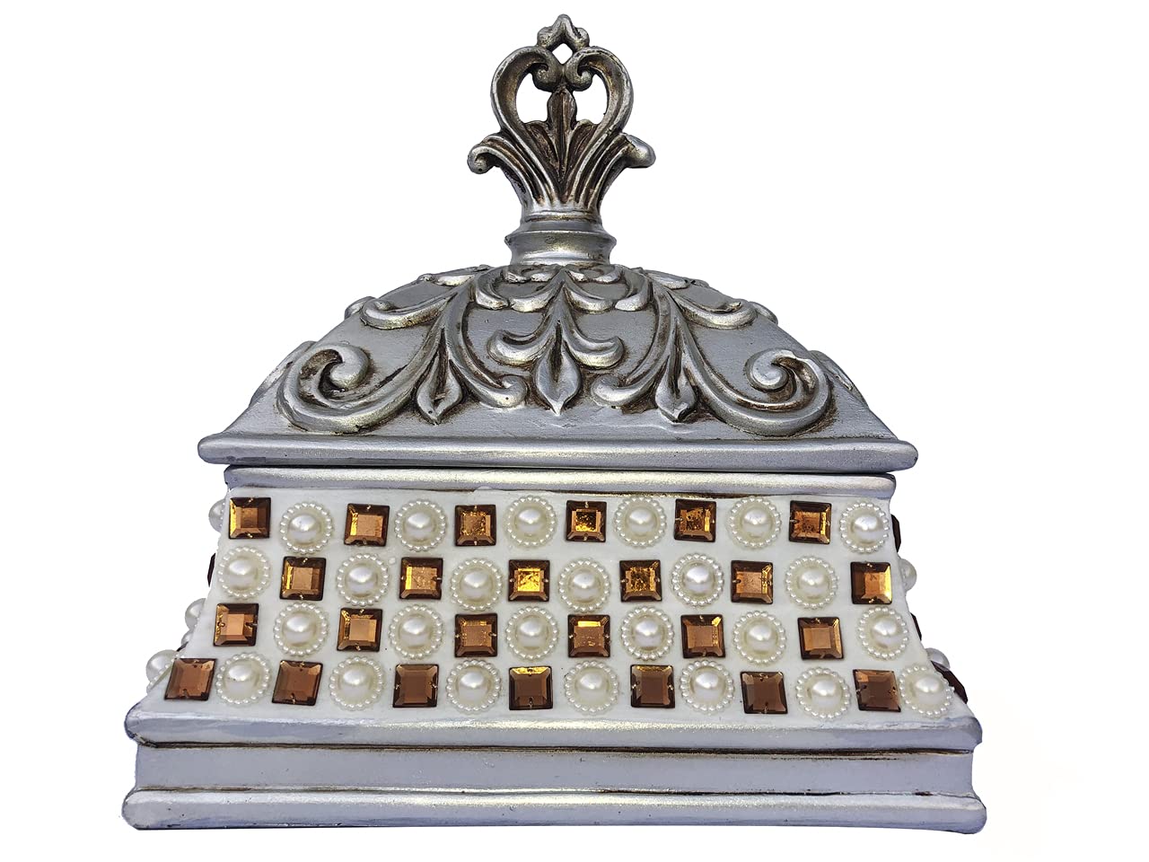 A 10" square x 11" tall jewelry box with removeable lid for storage from our Primrose Collection. A collection which combines transclucent hand applied primrose rhinestones and faux pearls intermittingly set against an antiqued silver and white finish. The item is hand cast in a durable polyeurethane resin. This item can be ordered seperately but pairs nicely with other items offerred from the Primrose Collection for larger visual displays.