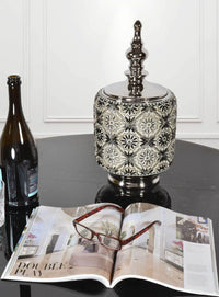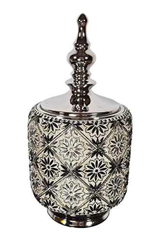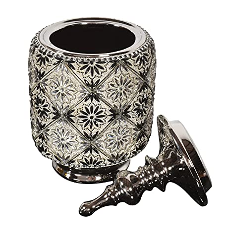 DescriptionAdd a designer touch to your home decor with this Silver Black Crystal Flower Canister. Hand Cast in Porcelain with Silver Plating. The vase is adorned with 100s of hand applied Rhinestone to create a delicate floral pattern.