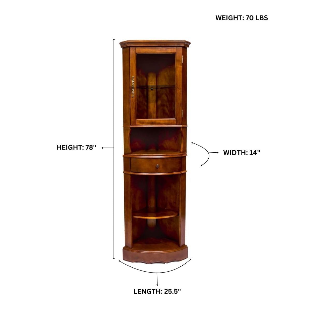 Elegant Cherry Wood Finish: The Classic Accents LY06 Corner Curio Cabinet boasts a cherry-colored birch veneer that adds a touch of timeless elegance to any entryway, hallway, living room, office, or bedroom. The rich finish enhances the cabinet's sophisticated design, making it a standout piece in any décor. | Sturdy Solid Wood Legs: Built with solid wood legs, this curio cabinet ensures both durability and style. The strong legs provide a stable foundation while contributing to the cabinet's refined and classic appearance, making it a reliable and beautiful addition to your home. | Functional Storage: Featuring a convenient middle drawer with dimensions of 15.5" W x 9.5" D x 3" H, the cabinet offers ample storage for smaller items. The drawer complements the spacious interior top and bottom cabinets, perfect for housing glassware, fine china, or treasured mementos. | Generous Dimensions: Measuring 25.5" W x 14" D x 78" H, this curio cabinet offers ample space for display and storage. The interior top cabinet (18" W x 11" D x 27" H) and bottom cabinet (18" W x 13" D x 27.5" H) provide plenty of room to showcase your favorite items and keep them organized. | Elegant Design: Combining classic charm with practical functionality, the LY06 Corner Curio Cabinet features an upper glass shelf and glass door that beautifully showcase your collectibles. Its stylish design, along with ample storage and display space, makes it a versatile and refined addition to any room.