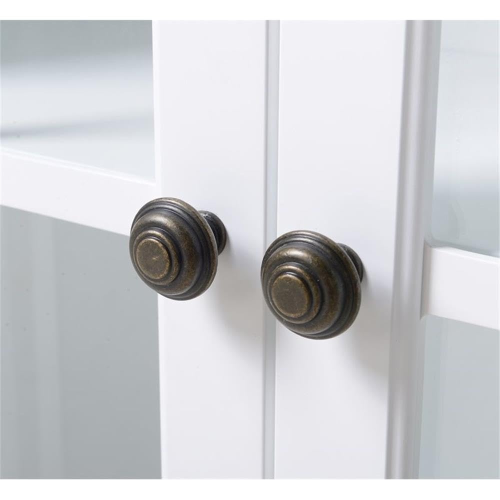 Add a tasteful accent to your living space with one of the OS Home and Office White Glass Door Display Cabinet, Model 22600. Framed, tempered glass doors, distinctive side panel design and durable high quality paint a striking addition to your furnishings. Elegant antique brass pull has a swirling design. Doors come with heavy duty hinges.