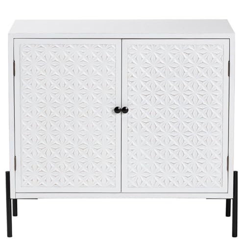 Beautify the mood of any layout with the classic charisma of the Nefeli storage cabinet. Made in China, this mid-century inspired piece consists of a sturdy wood frame fitted with solid metal legs. The doors open revealing two spacious shelves perfect for decluttering and organizing busy rooms. The Nefeli requires assembly and features carved detailing for geometric flair that highlights its round door knobs. Lending an air of grace, the Nefeli storage cabinet blends well with any layout.