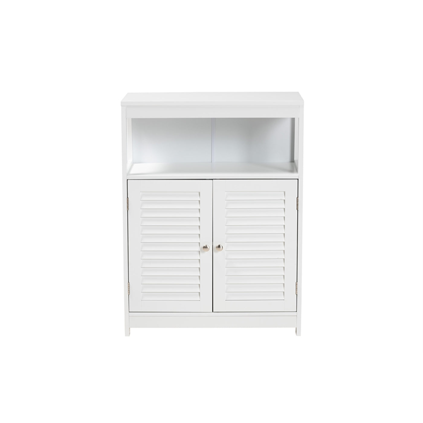 - Modern and contemporary bathroom cabinet - Constructed from Engineered Wood - Two (2) open shelves - Two (2) enclosed shelves behind the doors - Slatted wood doors - Round metal door handles - Rectangular tabletop.