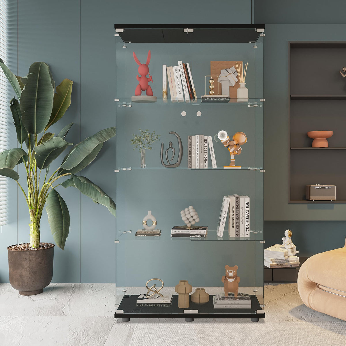 Beauty4U Glass Display Cabinet With 4 Shelves, 2 Doors Curio Cabinets For Living Room, Bedroom, Office, Black Floor Standing Glass Bookshelf, Quick Installation