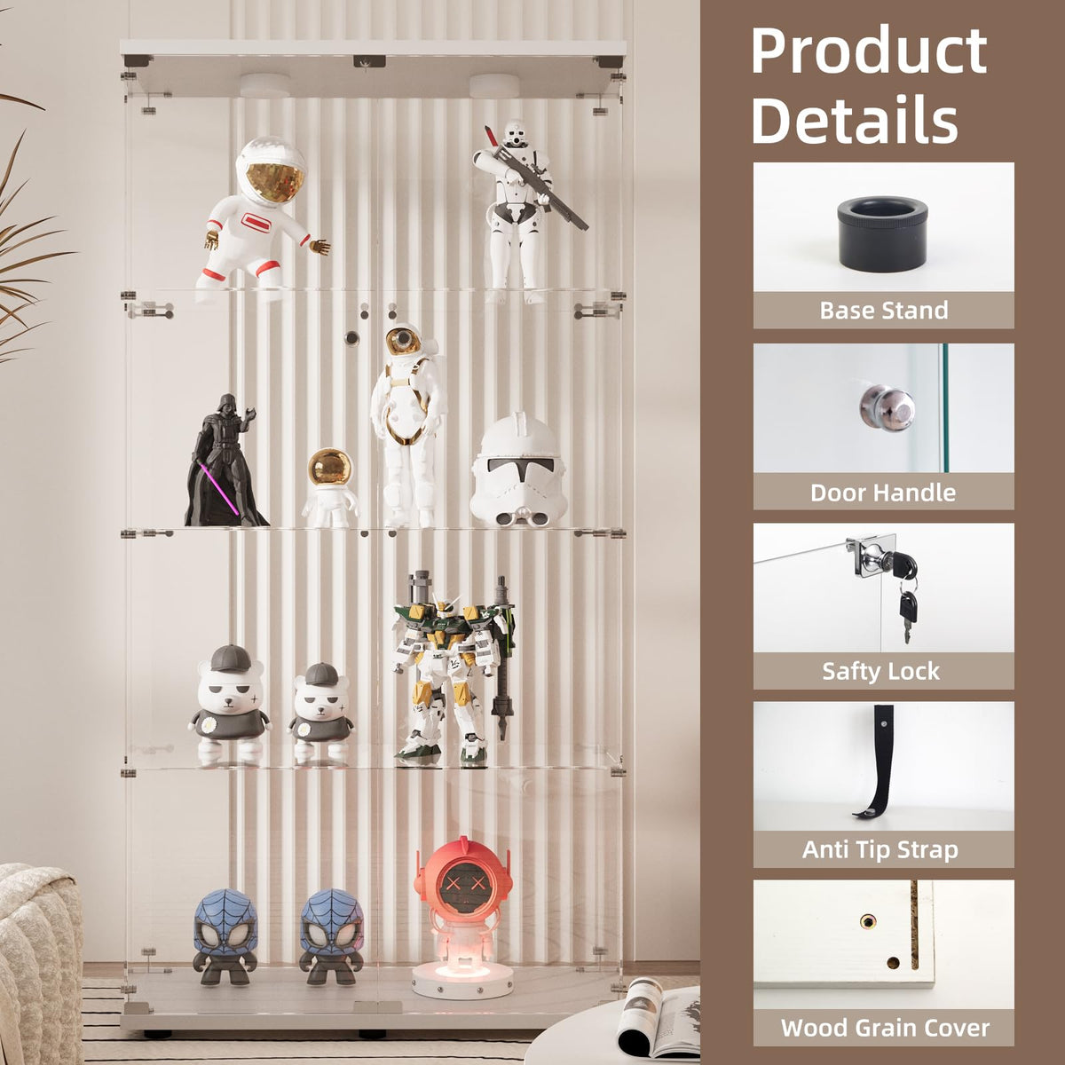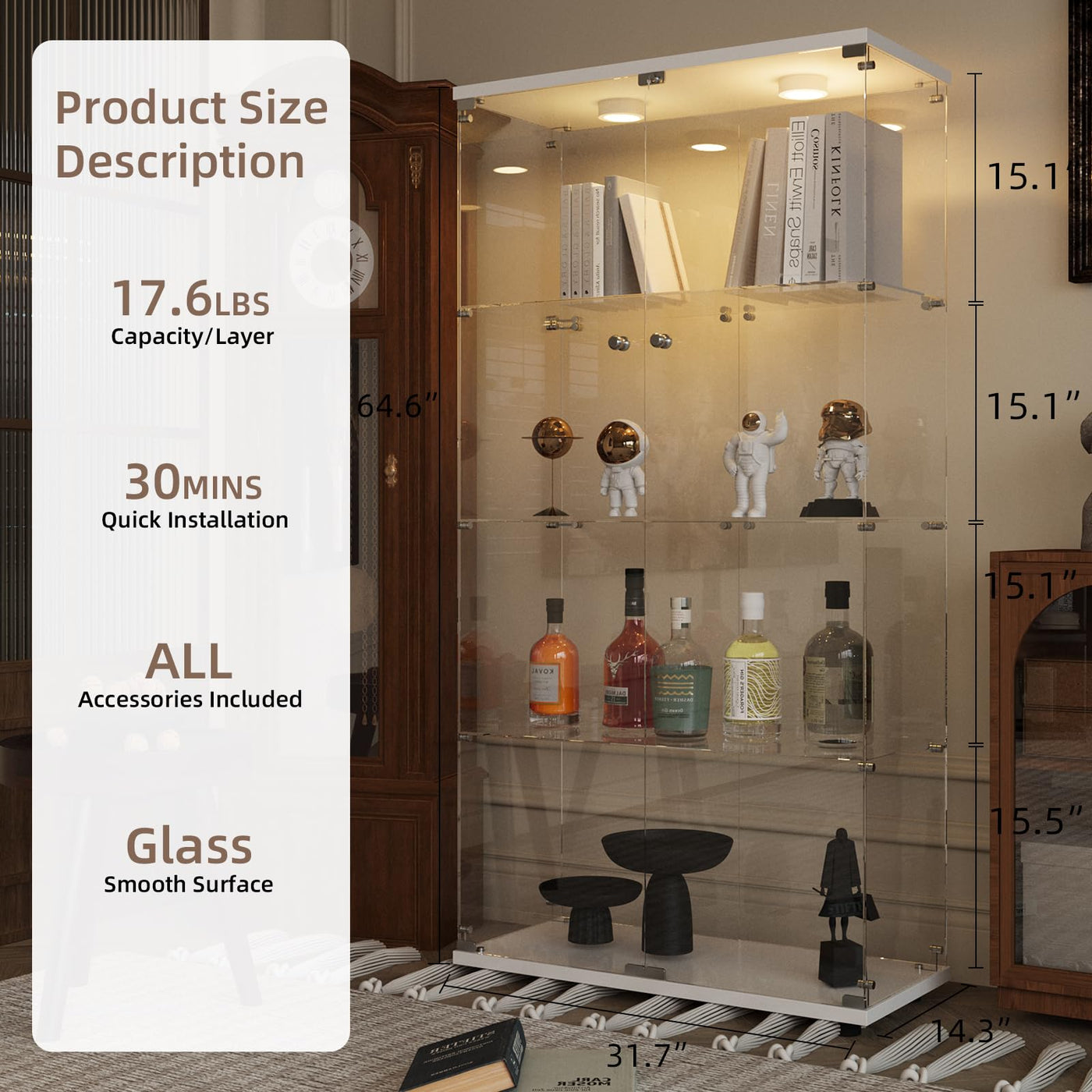 Beauty4U Glass Display Cabinet With Led Light, 4 Shelves With 2 Doors, Curio Cabinets For Living Room, Bedroom, Office, White Floor Standing Glass Bookshelf, Quick Installation