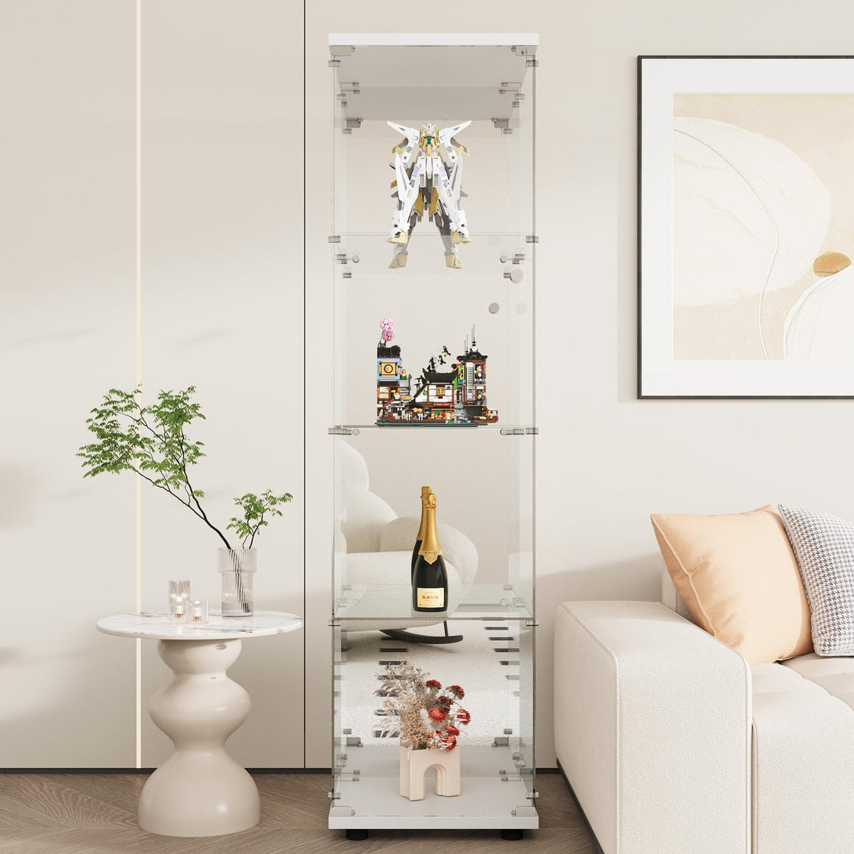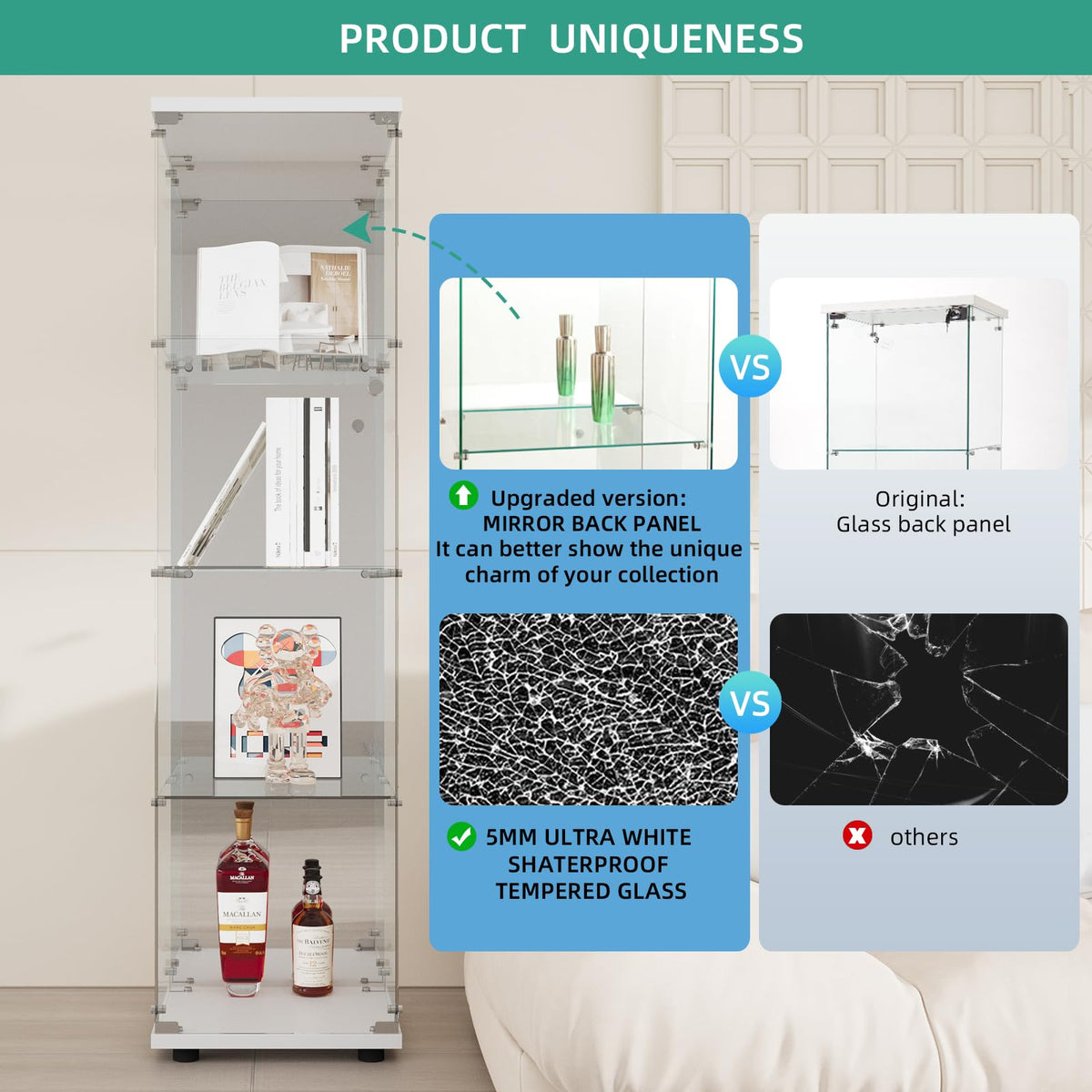 Dolls, photo albums, certificates, holiday memorabilia... whatever you collect or love to see, a display case means you can display your favorite things, but stay away from dust and sticky hands. Beauty4U Glass Display Cabinet has upgraded and simplified the assembly parts for faster and easier installation, allowing customers to easily complete the assembly of the glass bookcase at home. Its beautiful and fashionable shape can also be placed in different places, such as the living room, bedroom, and kitchen. The overall structure design of the glass plates and accessories of the glass curio cabinets make it more beautiful and stable, and a handle is installed on the door of the glass bookshelf to facilitate your switch. The glass cabinet's door also comes with a lock to further protect your collections or prevent accidental movement by children. The accessories also include an anti-dumping device, which prevents the cabinet from tipping over and threatening your personal safety. The glass door cabinet is made of 5mm thick tempered glass and solid wood cover, so you don't have to worry about the pungent smell of the cabinet. And metal mounting parts and door handles make the cabinet more durable.