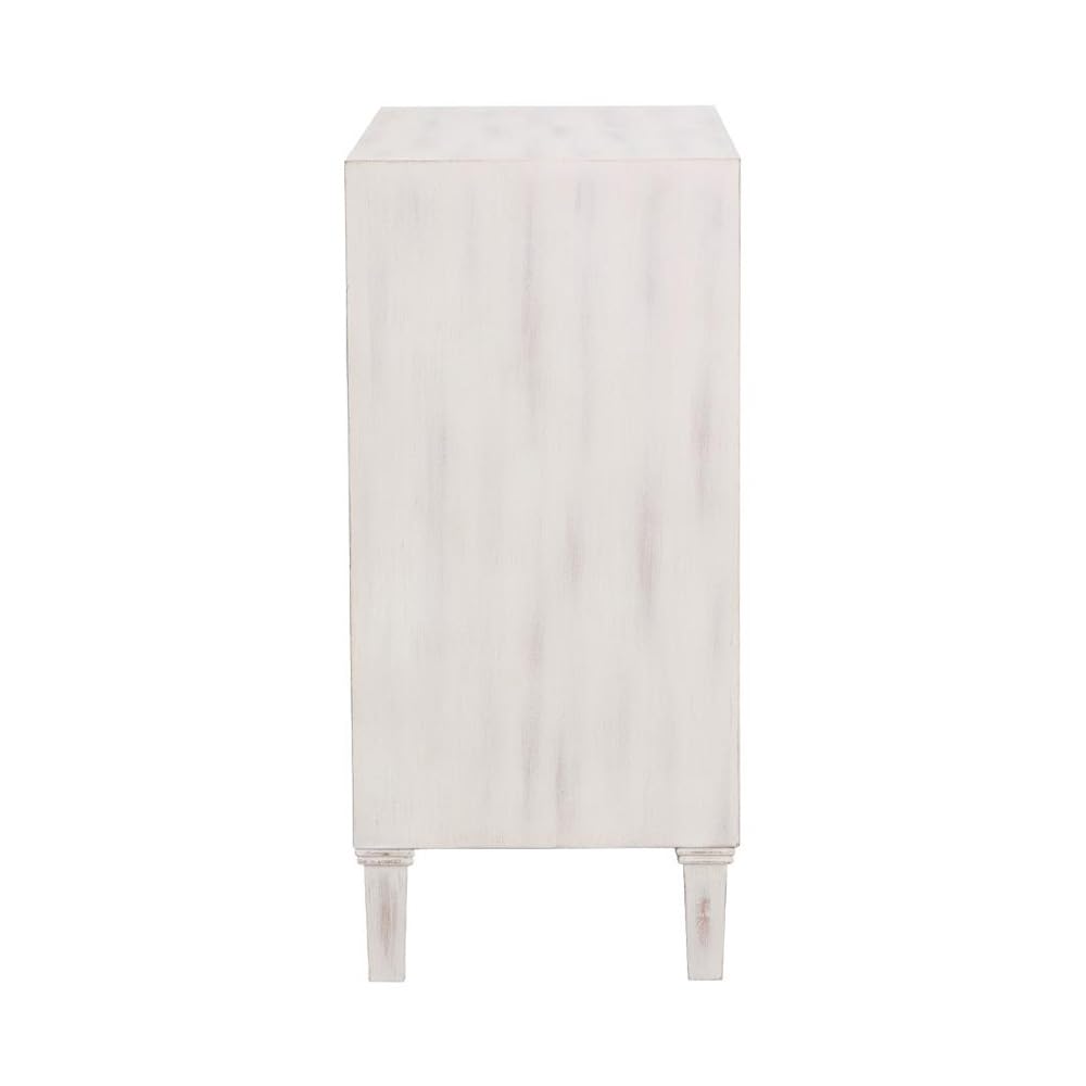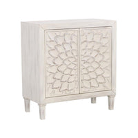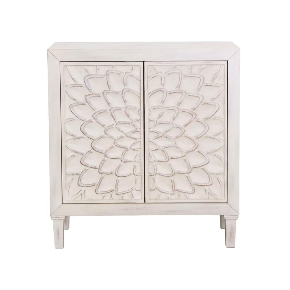 Create a beautifully styled living space that radiates classic elegance. This wooden storage cabinet is beautifully decorated with gorgeous, carved floral panels. A distressed white finish gives it a cool, country farmhouse vibe. Sturdy, tapered legs provide exceptional style and support. This classic cabinet offers generous storage space with a single shelf inside, making it easy to organize your space.