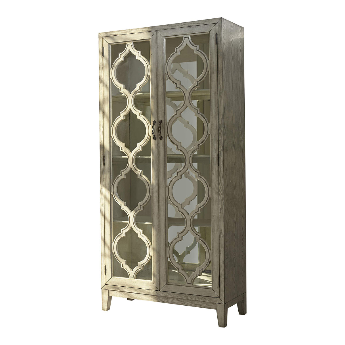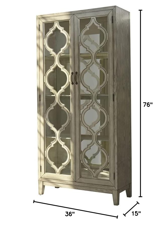 Intricate lattice woodwork creates a rich, luxurious look in any living or dining room. This two-door accent cabinet is a dramatic addition with vintage charm and plenty of interior storage behind two glass doors. The back panel of the cabinet is mirrored, making this a wonderful place to show off fine china, collectibles, and other treasures. Vintage style door handles put a charming finishing touch on this impressive cabinet. Framed doors and tapered block feet complete the look.