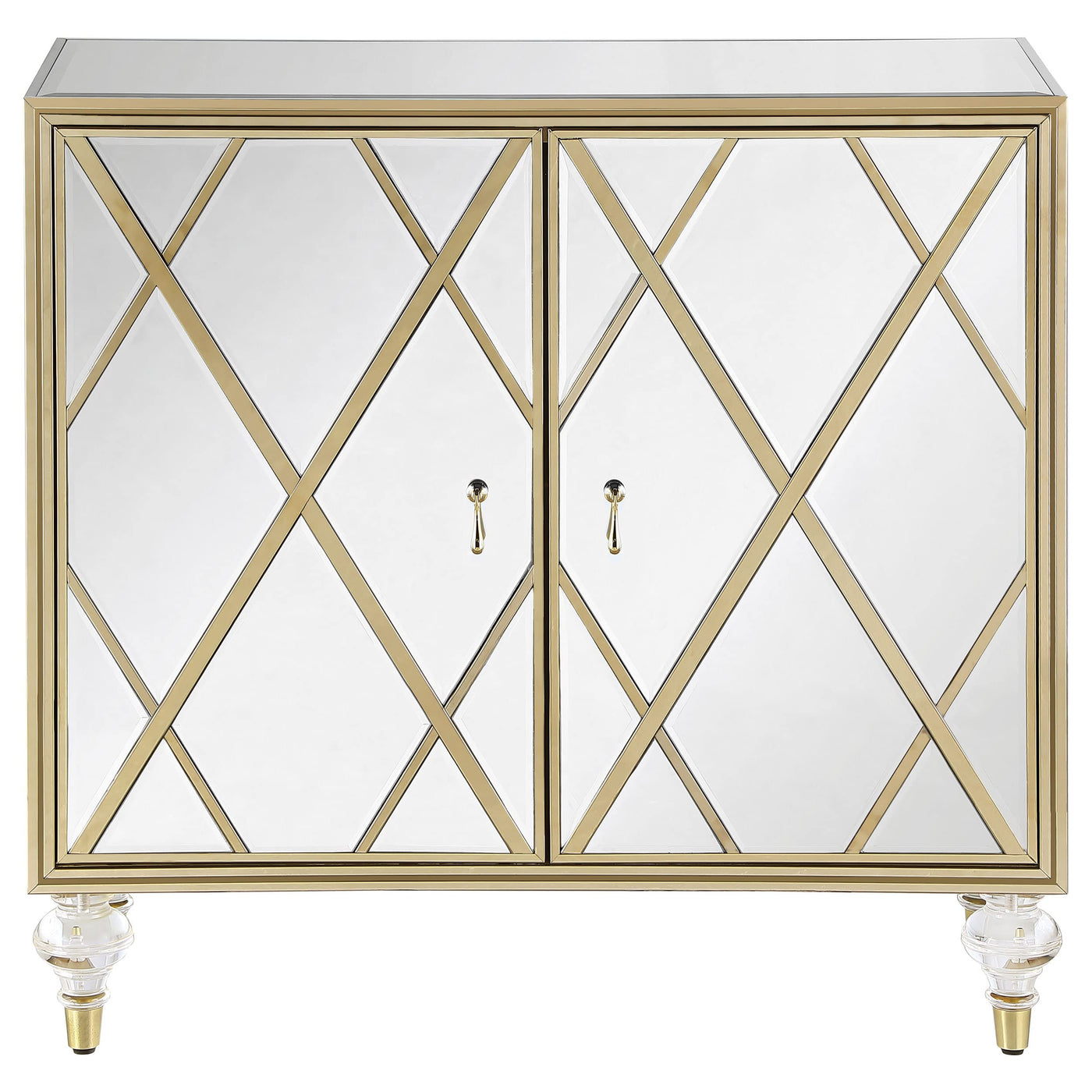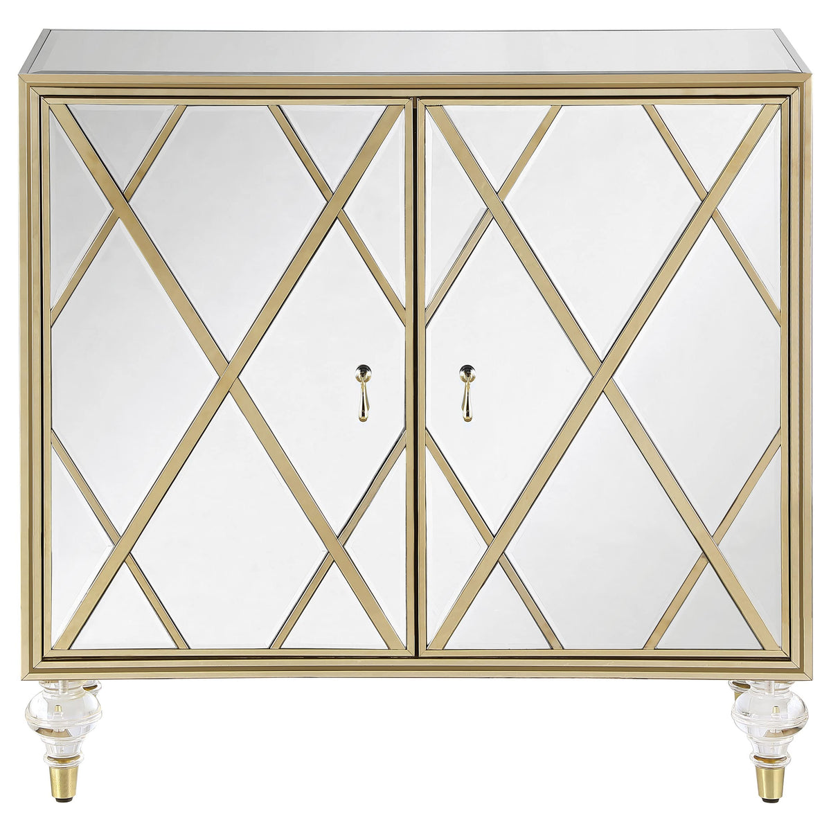 Polished materials and luxe accents combine to create this stunning, glam accent cabinet. Covered almost entirely in mirror surfaces, this accent cabinet boasts a latticed design in the dual cabinet doors, inset with a champagne diamond pattern. The shimmering champagne finish carries through in the borders, traditional teardrop pendant hardware and capped feet. Store personal effects inside, organized on the two shelves. Supported by elegantly turned acrylic legs that offer a transparent look, this accent chest exudes a regal, refined aesthetic.