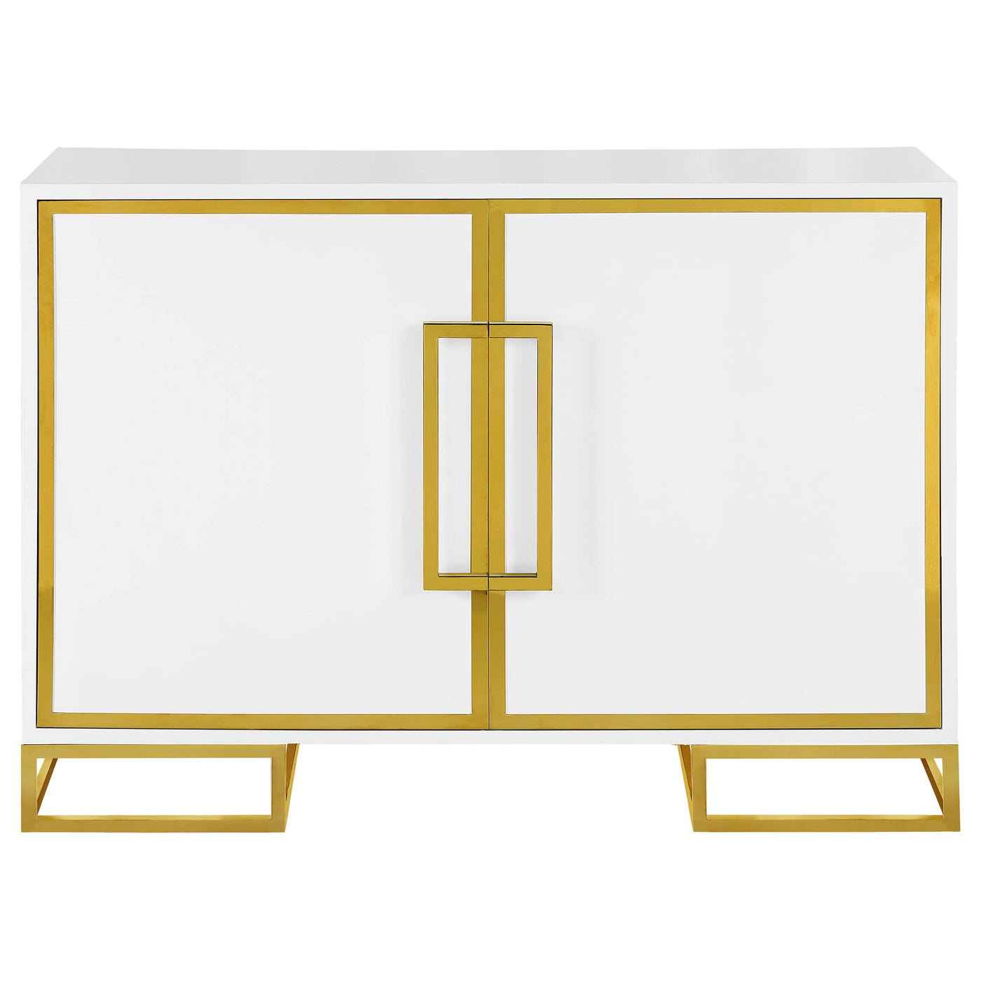 Clean lines and a chic two-tone design complete the sophisticated, modern accent cabinet. With Art Deco-inspired elements like open box-like base supports and a bright white finish, this elegant cabinet lends a glamorous touch to a space. Each open stainless steel metal base is finished in a lustrous gold tone, mirroring the bordered edges of the cabinet doors and the hardware. Inside the wide cabinet doors are two versatile, adjustable shelves, allowing you to organize and store items as you wish. Place this stylish accent cabinet in a space for an eye-catching, luxe addition.