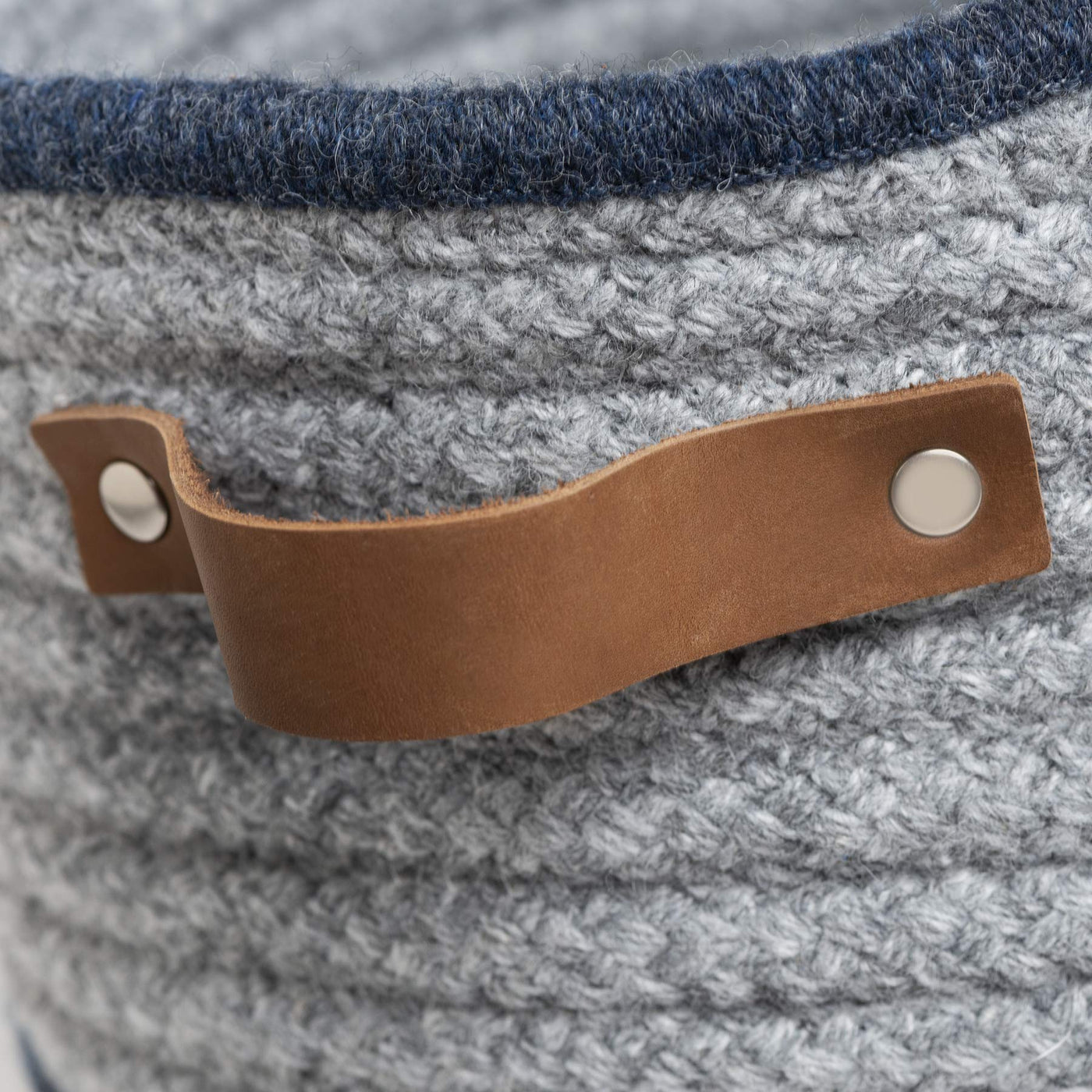 Inspired by the past. Designed for the present. Picturesque vintage-inspired design. Great for your home. Ideal for your family room. Perfect for your parlor. Store your pillows. Organize your throw blankets. Neutral tones. Muted accents. Decorative leather handles. Soft, but textured. Free-standing. 100% blended wool. Indoor use only.