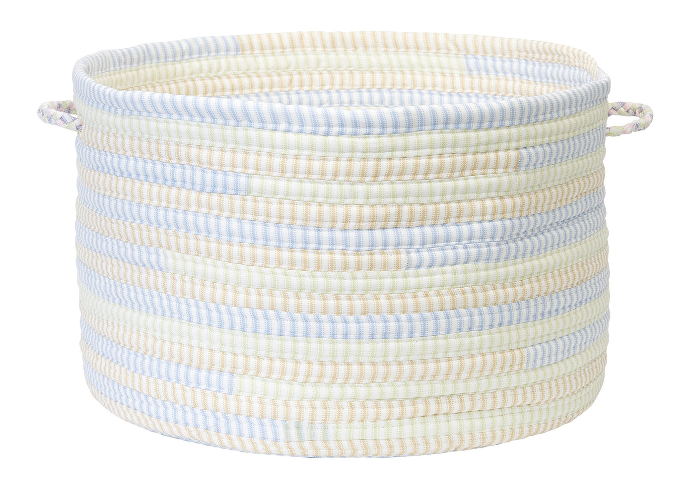 Cotton blend ticking stripe fabrics in soft colors create the perfect braided storage basket for blankets, books or more.