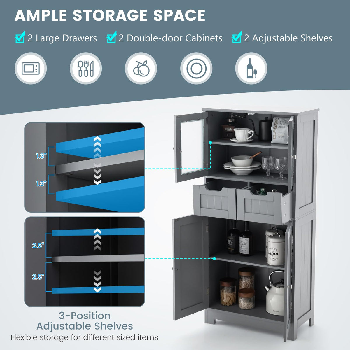 Costway Bathroom Storage Cabinet, Freestanding Bathroom Organizer With Glass Doors, 2 Drawers And 2 Adjustable Shelves, Tall Linen Floor Cabinet For Bathroom, Living Room, Kitchen (Gray)