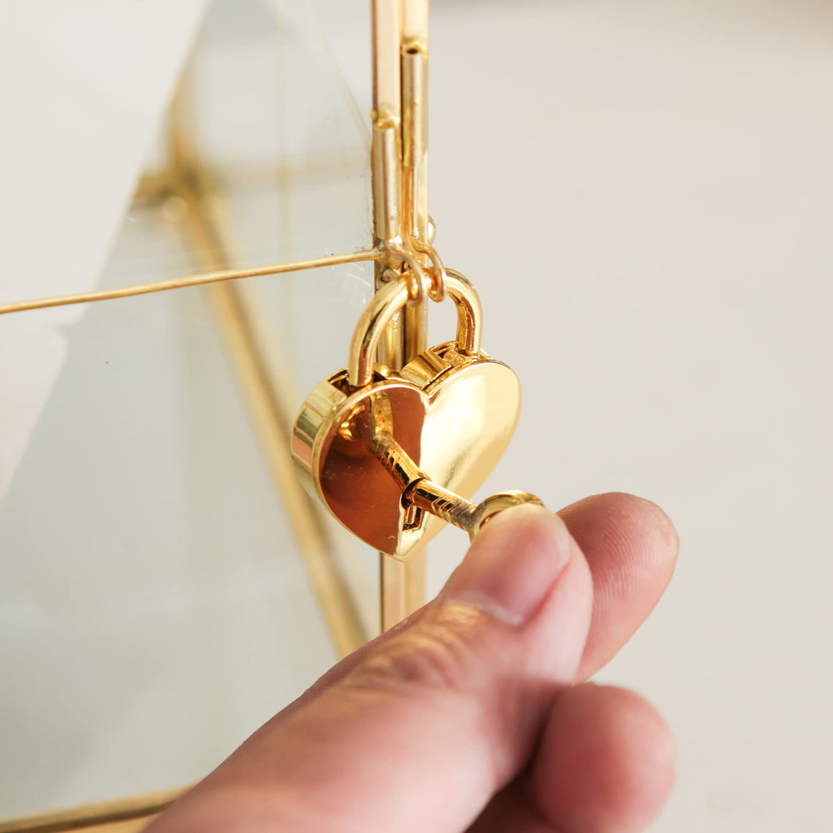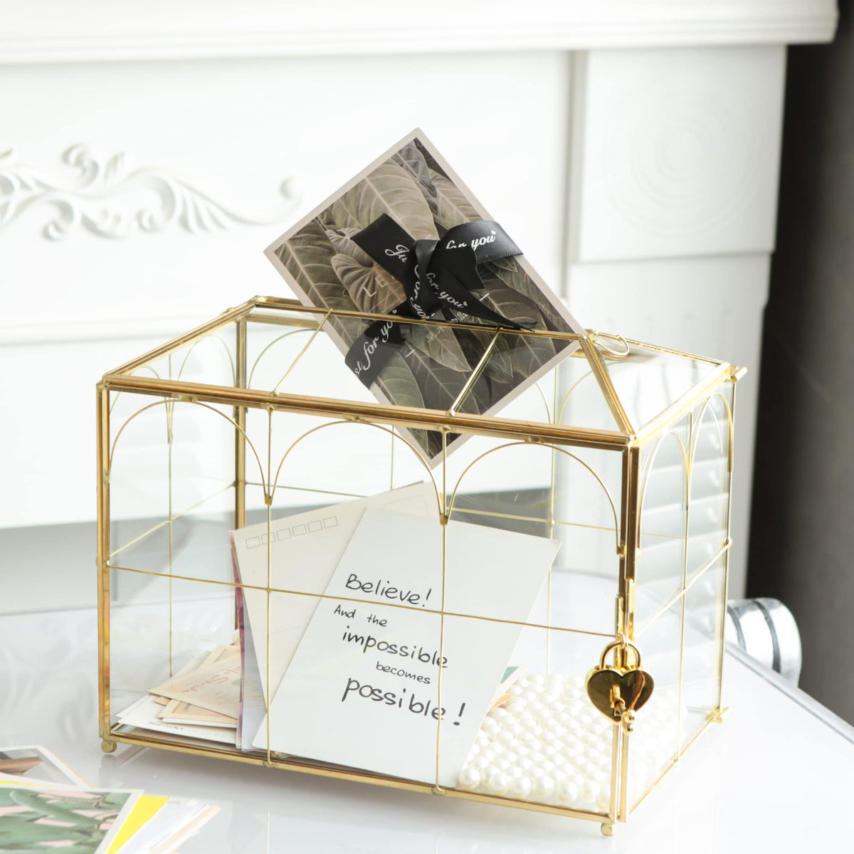 This Exquisite Glass Card Box Is The Ideal Choice To Showcase And Protect Your Precious Cards. It Is Made Of High-Quality Glass Material With A Golden Copper Bar Frame, Adding A Touch Of Luxury And Elegance. The Design Of The Card Box Is Unique, Featuring A Groove That Accommodates Cards Up To 6.5 Inches In Length, Allowing You To Effortlessly Display The Beauty Of Your Cards.The Side-Opening Design Of The Card Box Is Convenient, Allowing You To Easily Open And Close The Box. Furthermore, It Comes With A Lock Mechanism, Ensuring The Security Of Your Cards. The Card Box Is Accompanied By A Beautiful Heart-Shaped Lock And Two Keys, Giving You Complete Control Over The Safety Of Your Cards.The Design Of The Glass Card Box Balances Practicality And Capacity. With Its Large Storage Capacity, It Can Hold Approximately 150 Cards, Enabling You To Conveniently Store And Organize Your Precious Card Collection. Whether It'S Birthday Cards, Holiday Greetings, Or Cards For Special Occasions, They Can Be Easily Placed In The Card Box, Showcasing Your Personal Style And Taste.This Glass Card Box Is Not Only A Practical Storage Solution But Also A Beautiful Decorative Piece. It Is Suitable For Various Occasions, Including Homes, Offices, Weddings, Birthday Parties, And More. Displaying Your Precious Card Collection In This Glass Card Box Not Only Protects Them From Damage But Also Adds A Unique Artistic Atmosphere To Your Space.During The Christmas Season, This Card Box Is Also A Perfect Gift Choice. You Can Give It As A Special Gift To Your Family, Friends, Or Colleagues, Allowing Them To Store And Display Their Precious Christmas Cards. This Card Box Is Not Only A Practical Gift But Also A Heartfelt Expression Of Warmth And Care.To Create A Festive Christmas Atmosphere, You Can Place Some Exquisite Miniature Christmas Tree Decorations In The Card Box, Such As Mini Christmas Trees, Snowmen, Christmas Stockings, And More.
