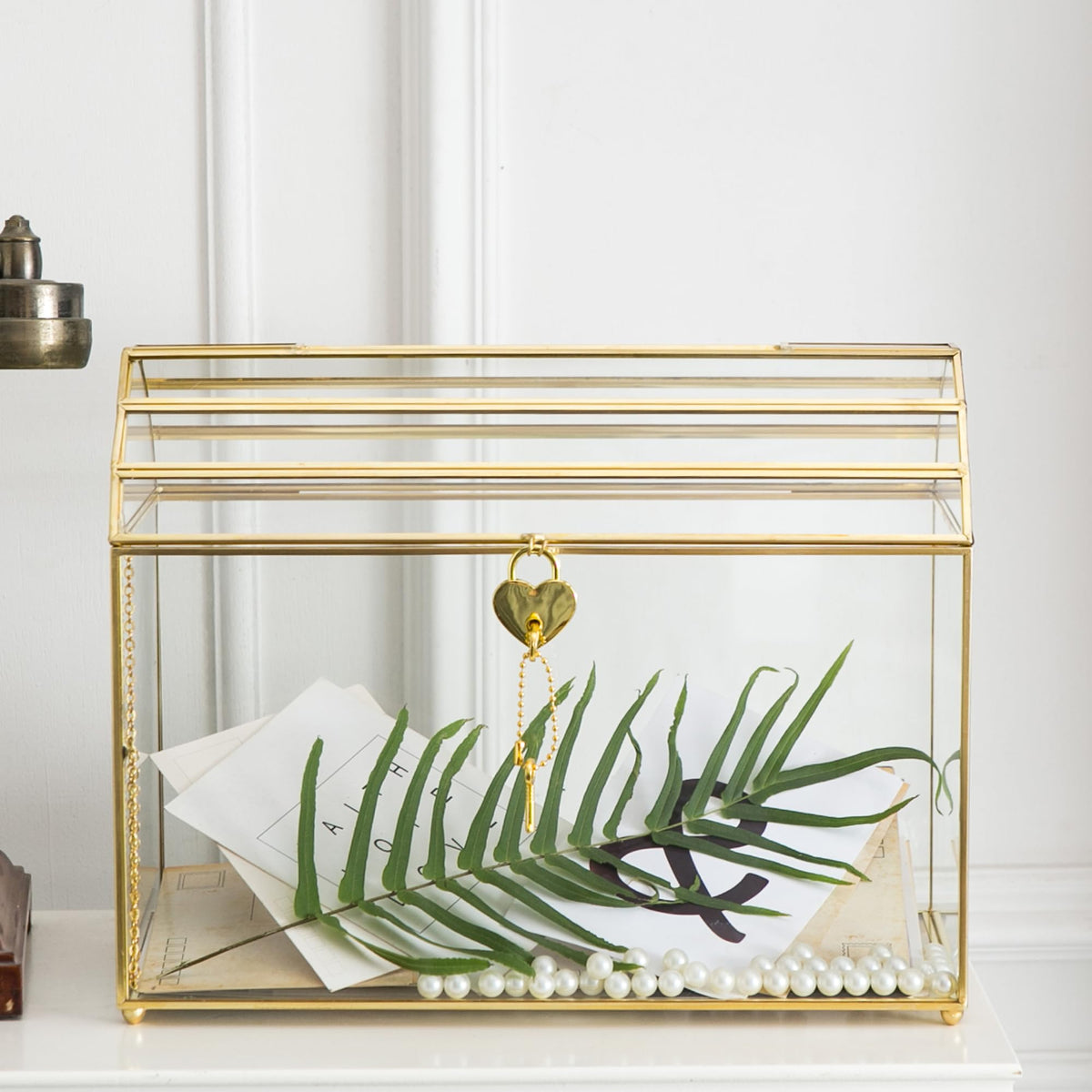 Crafted With A Combination Of Glass And A Stunning Gold Frame, This Card Box Is A True Showstopper. Its Captivating Design Features A Heart-Shaped Lock, Accompanied By Two Matching Keys, Adding A Touch Of Romance And Intrigue.Designed With Convenience In Mind, This Card Box Boasts A Flip-Top Lid, Allowing You To Effortlessly Unlock And Retrieve Your Cherished Cards. The Glass Construction Provides A Clear View Of The Contents, Beautifully Showcasing The Heartfelt Messages And Sentiments Contained Within.Measuring Generously, This Card Box Offers Ample Space To Accommodate Cards Up To 6.5 Inches In Length, Thanks To Its Thoughtfully Designed Grooves. Whether It'S Christmas Cards, Special Occasion Greetings, Or Heartfelt Notes, This Versatile Box Keeps Them Organized And Protected.Not Limited To Cards Alone, This Multi-Functional Glass Card Box Is Also Perfect For Displaying Dried Flowers, Small Decorations, Or Treasured Collectibles. Its Versatility Makes It An Ideal Addition To Any Home Decor, Adding A Touch Of Sophistication And Charm.Indulge Yourself Or Surprise Your Loved Ones With This Remarkable Glass Card Box. It'S An Ideal Gift For Birthdays, Weddings, Anniversaries, Or Any Special Occasion. Embrace The Beauty Of This Glass Card Box And Elevate The Art Of Preserving And Showcasing Your Precious Memories.