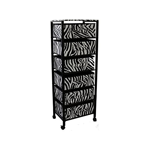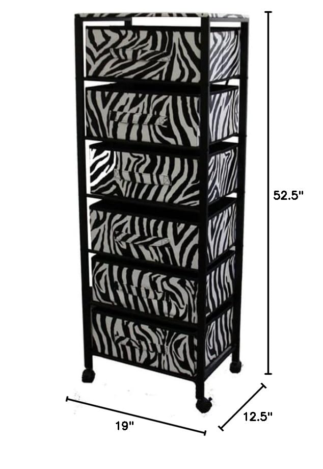 Clear the clutter and make the most of the unused vertical space with this vibrant Zebra Black and White Rolling Six Drawer Tower Organizer. This fun and fabulous looking storage unit features a sturdy metal frame with a black finish and 6 large drawers made out of modern zebra print fabric. The beautiful large drawers are perfect for storing anything from clothes to shoes and cosmetics. A set of lockable wheels allows it to be easily moved to your bedroom, laundry, room, bathroom, dressing room, or anywhere else. With its sleek metal frame and super trendy zebra print fabric, it is a real eye-catcher that will be super helpful in organizing and keeping things neat. 52.5' H x 19' W x 12.5' D