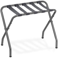 Q: What materials is the luggage rack made of?A: The luggage rack features a sturdy steel frame with gray painted iron pipes and fixed nylon straps, ensuring durability and long-term use.