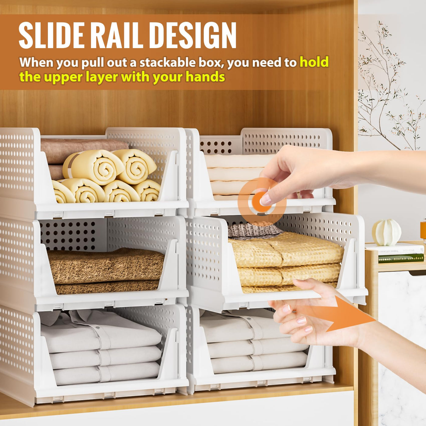 ?Slide Rails Design?The slide rails design on the bottom makes it easy to pick items even if it is in most inner. No worry about messing up the stuff on top. It is especially a good solution for stacked clothes storage.