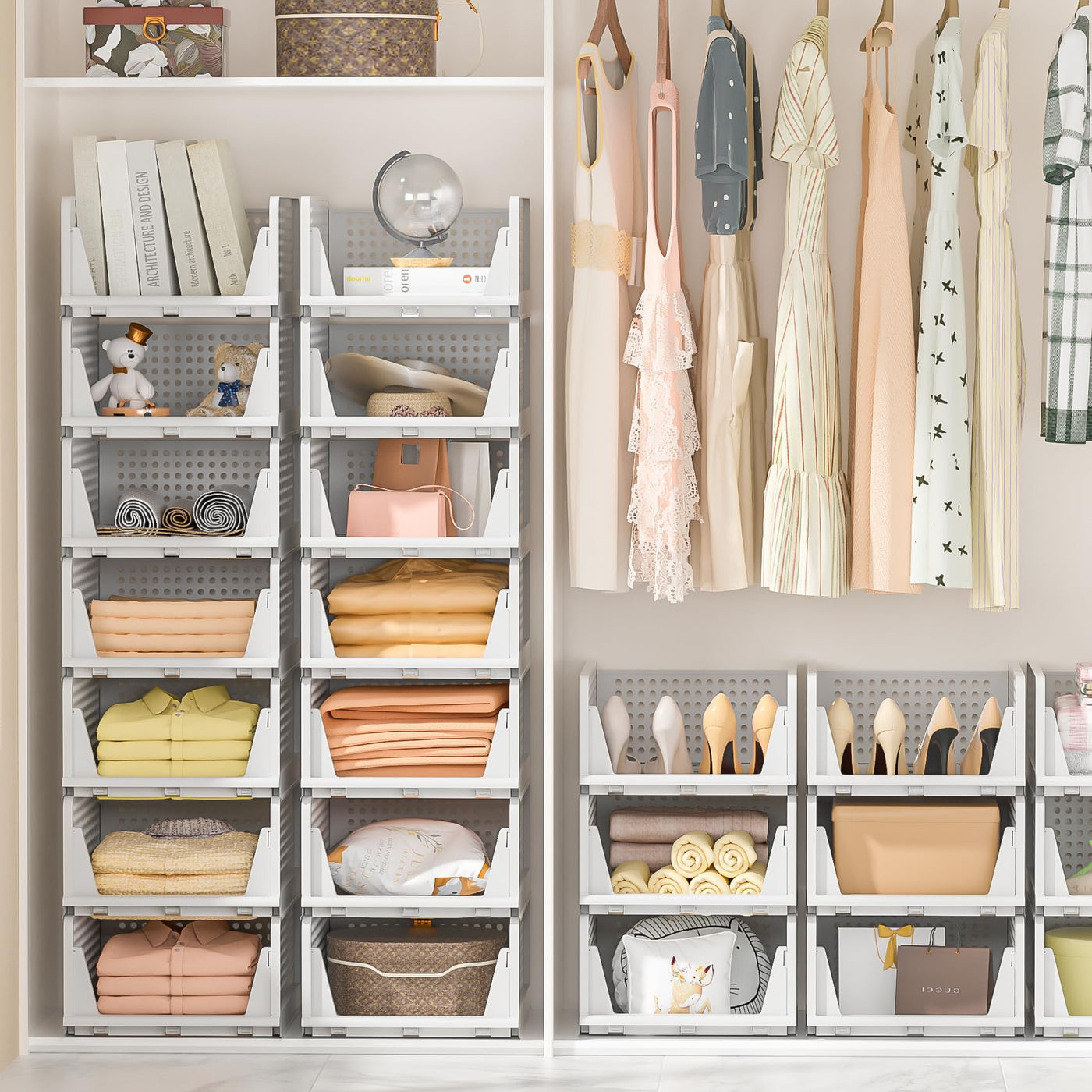 ?Multi-Functional?The stackable storage bins are perfect for storing all kinds of items such as t-shirts, towels, clothes, toys, snacks, books, files, etc. Suitable for closet, dorm room, bathroom, kitchen, living room, office. Each bin size is 16.9”L x 13.1”W x7.3”H”H.