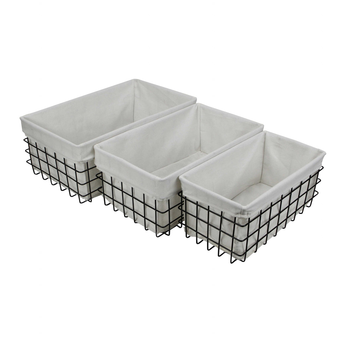 Set Of 3 Rectangular White Lined And Metal Wire Baskets